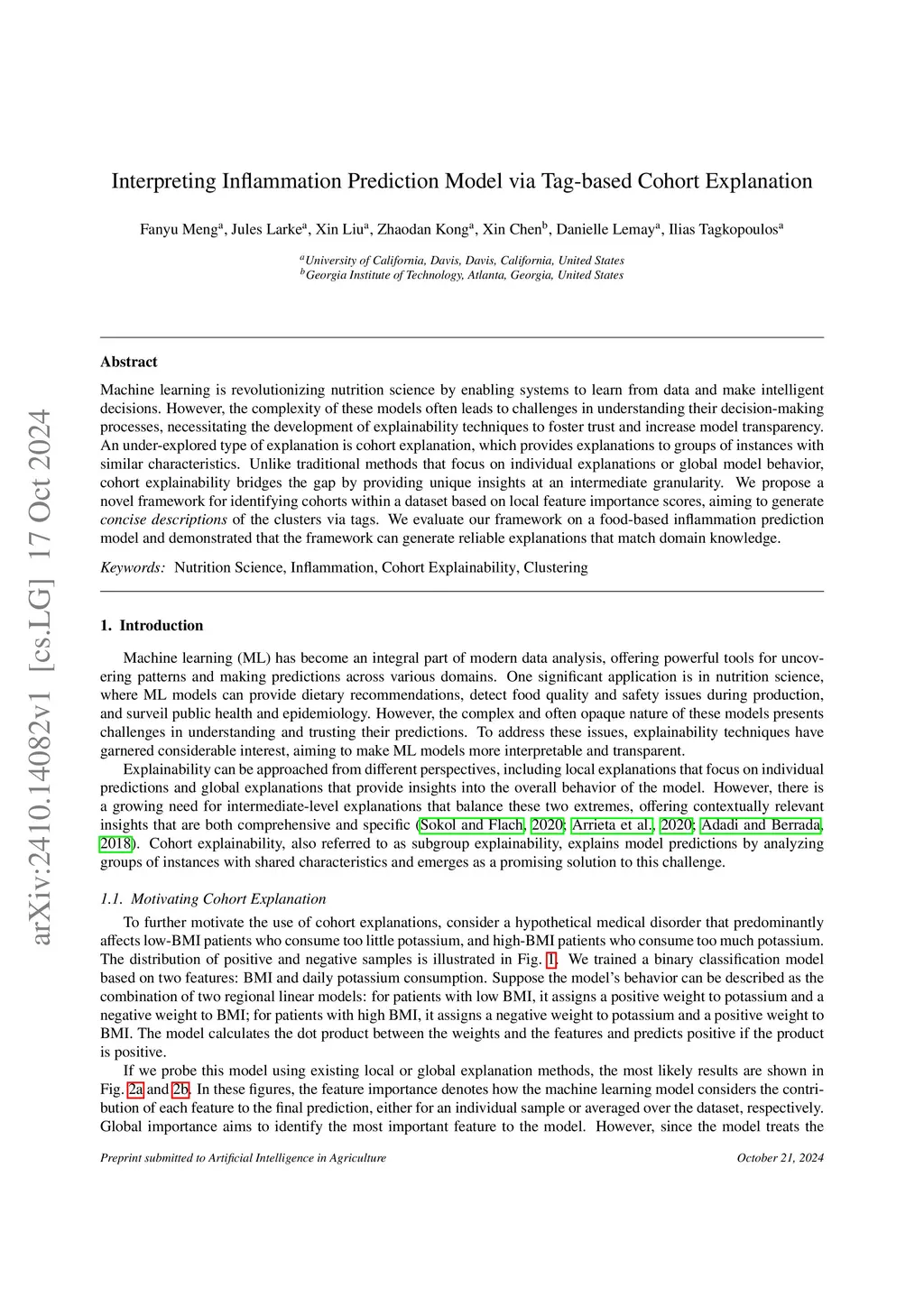 Machine learning is revolutionizing nutrition science by enabling systems to learn from data and make intelligent decisions. However, the complexity of these models often leads to challenges in understanding their decision-making processes, necessitating the development of explainability techniques to foster trust and increase model transparency. An under-explored type of explanation is cohort explanation, which provides explanations to groups of instances with similar characteristics. Unlike traditional methods that focus on individual explanations or global model behavior, cohort explainability bridges the gap by providing unique insights at an intermediate granularity. We propose a novel framework for identifying cohorts within a dataset based on local feature importance scores, aiming to generate concise descriptions of the clusters via tags. We evaluate our framework on a food-based inflammation prediction model and demonstrated that the framework can generate reliable explanations that match domain knowledge.