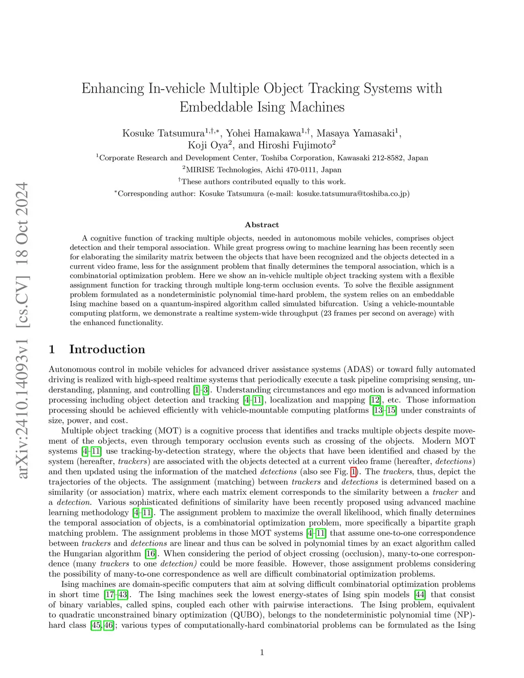 A cognitive function of tracking multiple objects, needed in autonomous mobile vehicles, comprises object detection and their temporal association. While great progress owing to machine learning has been recently seen for elaborating the similarity matrix between the objects that have been recognized and the objects detected in a current video frame, less for the assignment problem that finally determines the temporal association, which is a combinatorial optimization problem. Here we show an in-vehicle multiple object tracking system with a flexible assignment function for tracking through multiple long-term occlusion events. To solve the flexible assignment problem formulated as a nondeterministic polynomial time-hard problem, the system relies on an embeddable Ising machine based on a quantum-inspired algorithm called simulated bifurcation. Using a vehicle-mountable computing platform, we demonstrate a realtime system-wide throughput (23 frames per second on average) with the enhanced functionality.