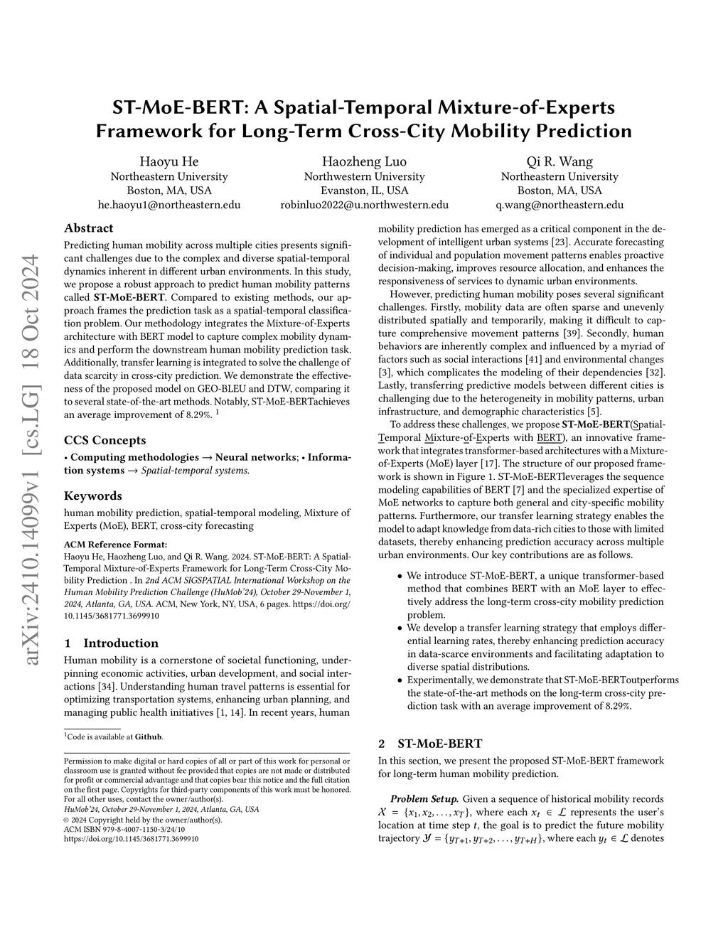 Predicting human mobility across multiple cities presents significant challenges due to the complex and diverse spatial-temporal dynamics inherent in different urban environments. In this study, we propose a robust approach to predict human mobility patterns called ST-MoE-BERT. Compared to existing methods, our approach frames the prediction task as a spatial-temporal classification problem. Our methodology integrates the Mixture-of-Experts architecture with BERT model to capture complex mobility dynamics and perform the downstream human mobility prediction task. Additionally, transfer learning is integrated to solve the challenge of data scarcity in cross-city prediction. We demonstrate the effectiveness of the proposed model on GEO-BLEU and DTW, comparing it to several state-of-the-art methods. Notably, ST-MoE-BERT achieves an average improvement of 8.29%.