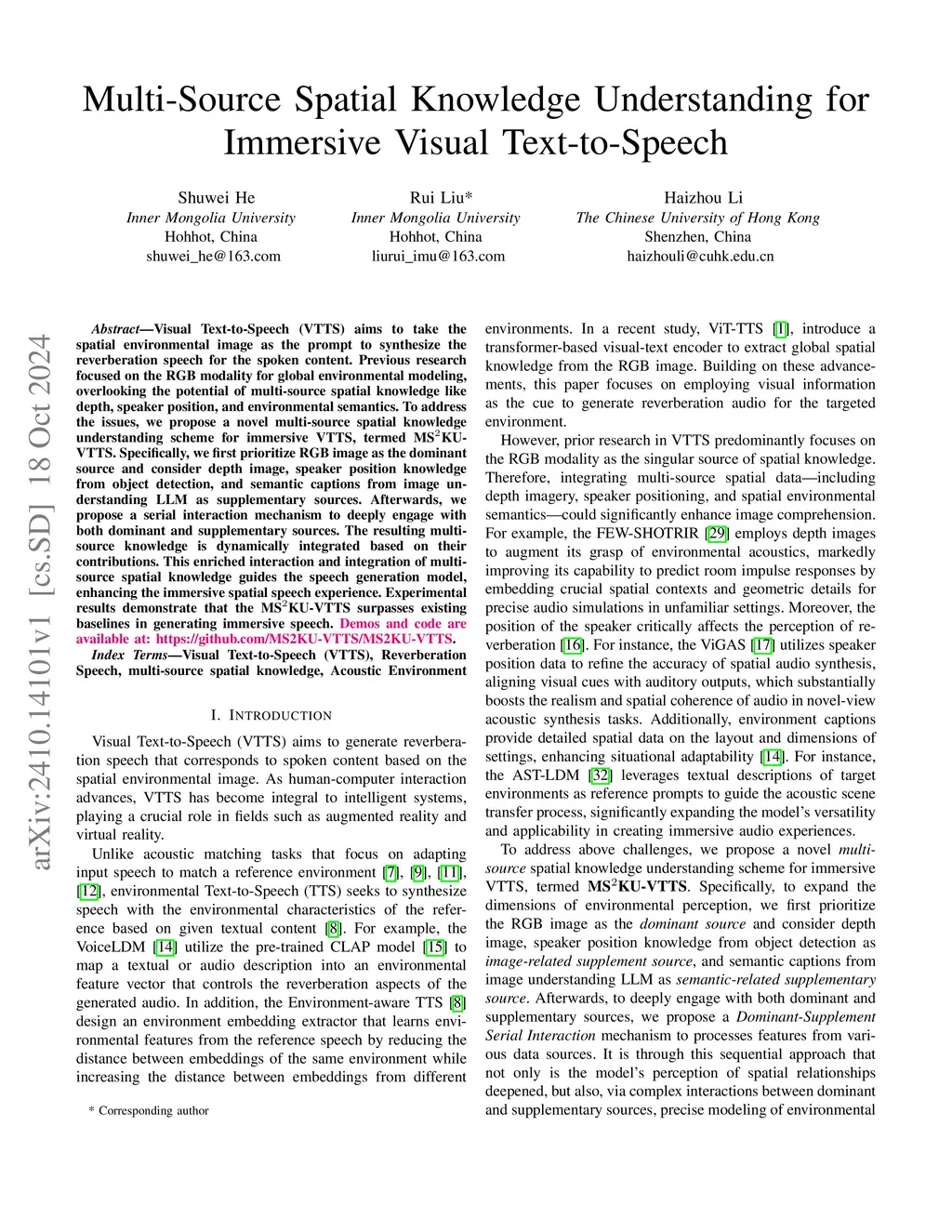 Visual Text-to-Speech (VTTS) aims to take the spatial environmental image as the prompt to synthesize the reverberation speech for the spoken content. Previous research focused on the RGB modality for global environmental modeling, overlooking the potential of multi-source spatial knowledge like depth, speaker position, and environmental semantics. To address the issues, we propose a novel multi-source spatial knowledge understanding scheme for immersive VTTS, termed MSKU-VTTS. Specifically, we first prioritize RGB image as the dominant source and consider depth image, speaker position knowledge from object detection, and semantic captions from image understanding LLM as supplementary sources. Afterwards, we propose a serial interaction mechanism to deeply engage with both dominant and supplementary sources. The resulting multi-source knowledge is dynamically integrated based on their contributions.This enriched interaction and integration of multi-source spatial knowledge guides the speech generation model, enhancing the immersive spatial speech experience.Experimental results demonstrate that the MSKU-VTTS surpasses existing baselines in generating immersive speech. Demos and code are available at: https://github.com/MS2KU-VTTS/MS2KU-VTTS.