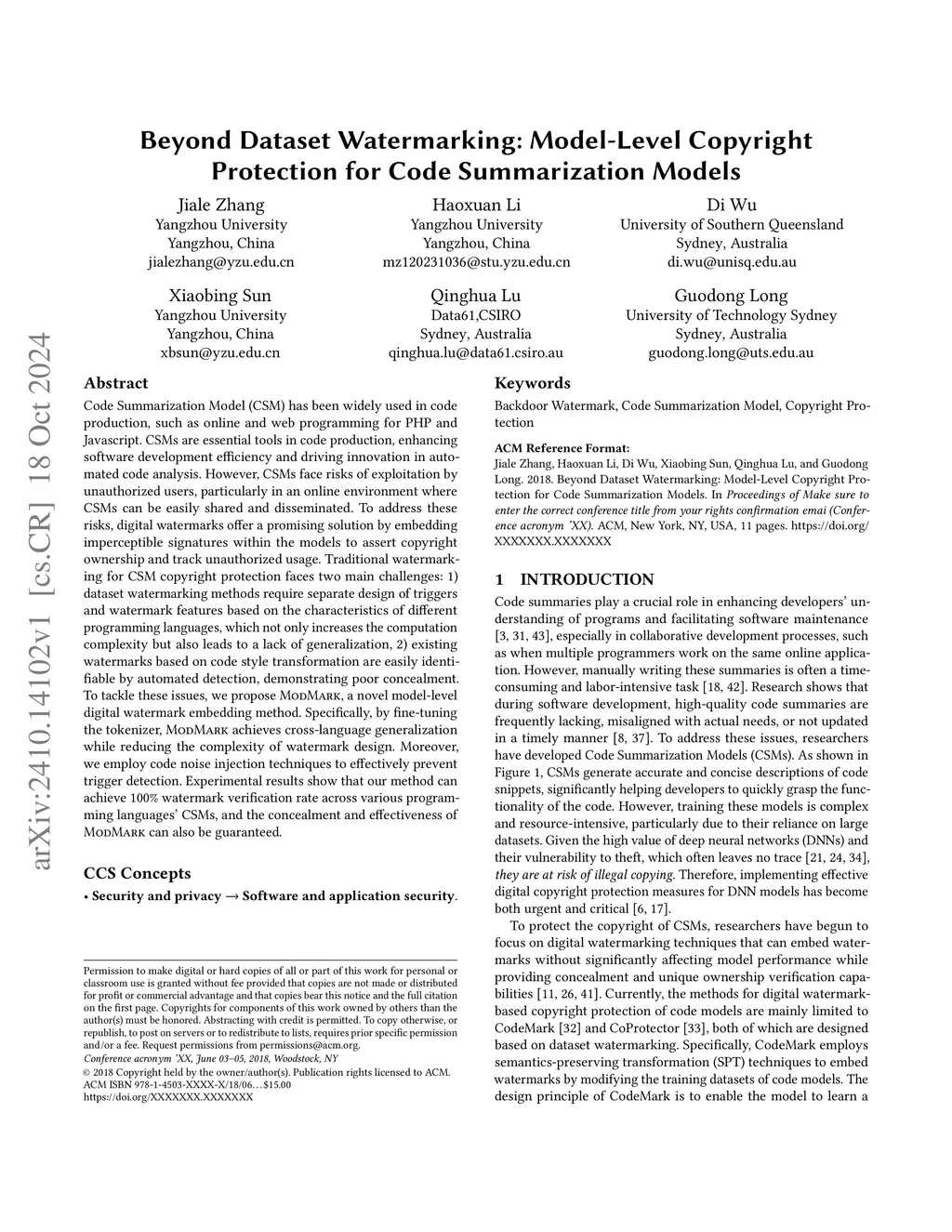 Code Summarization Model (CSM) has been widely used in code production, such as online and web programming for PHP and Javascript. CSMs are essential tools in code production, enhancing software development efficiency and driving innovation in automated code analysis. However, CSMs face risks of exploitation by unauthorized users, particularly in an online environment where CSMs can be easily shared and disseminated. To address these risks, digital watermarks offer a promising solution by embedding imperceptible signatures within the models to assert copyright ownership and track unauthorized usage. Traditional watermarking for CSM copyright protection faces two main challenges: 1) dataset watermarking methods require separate design of triggers and watermark features based on the characteristics of different programming languages, which not only increases the computation complexity but also leads to a lack of generalization, 2) existing watermarks based on code style transformation are easily identifiable by automated detection, demonstrating poor concealment. To tackle these issues, we propose ModMark , a novel model-level digital watermark embedding method. Specifically, by fine-tuning the tokenizer, ModMark achieves cross-language generalization while reducing the complexity of watermark design. Moreover, we employ code noise injection techniques to effectively prevent trigger detection. Experimental results show that our method can achieve 100% watermark verification rate across various programming languages' CSMs, and the concealment and effectiveness of ModMark can also be guaranteed.