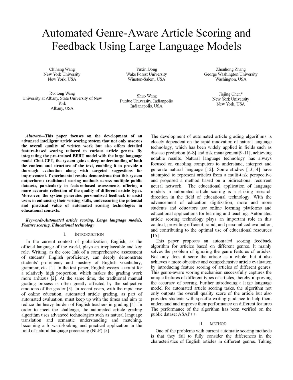 Automated Genre-Aware Article Scoring and Feedback Using Large Language