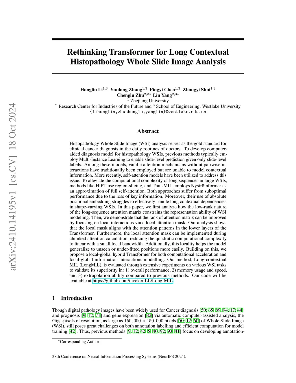 Histopathology Whole Slide Image (WSI) analysis serves as the gold standard for clinical cancer diagnosis in the daily routines of doctors. To develop computer-aided diagnosis model for WSIs, previous methods typically employ Multi-Instance Learning to enable slide-level prediction given only slide-level labels. Among these models, vanilla attention mechanisms without pairwise interactions have traditionally been employed but are unable to model contextual information. More recently, self-attention models have been utilized to address this issue. To alleviate the computational complexity of long sequences in large WSIs, methods like HIPT use region-slicing, and TransMIL employs approximation of full self-attention. Both approaches suffer from suboptimal performance due to the loss of key information. Moreover, their use of absolute positional embedding struggles to effectively handle long contextual dependencies in shape-varying WSIs. In this paper, we first analyze how the low-rank nature of the long-sequence attention matrix constrains the representation ability of WSI modelling. Then, we demonstrate that the rank of attention matrix can be improved by focusing on local interactions via a local attention mask. Our analysis shows that the local mask aligns with the attention patterns in the lower layers of the Transformer. Furthermore, the local attention mask can be implemented during chunked attention calculation, reducing the quadratic computational complexity to linear with a small local bandwidth. Building on this, we propose a local-global hybrid Transformer for both computational acceleration and local-global information interactions modelling. Our method, Long-contextual MIL (LongMIL), is evaluated through extensive experiments on various WSI tasks to validate its superiority. Our code will be available at github.com/invoker-LL/Long-MIL.