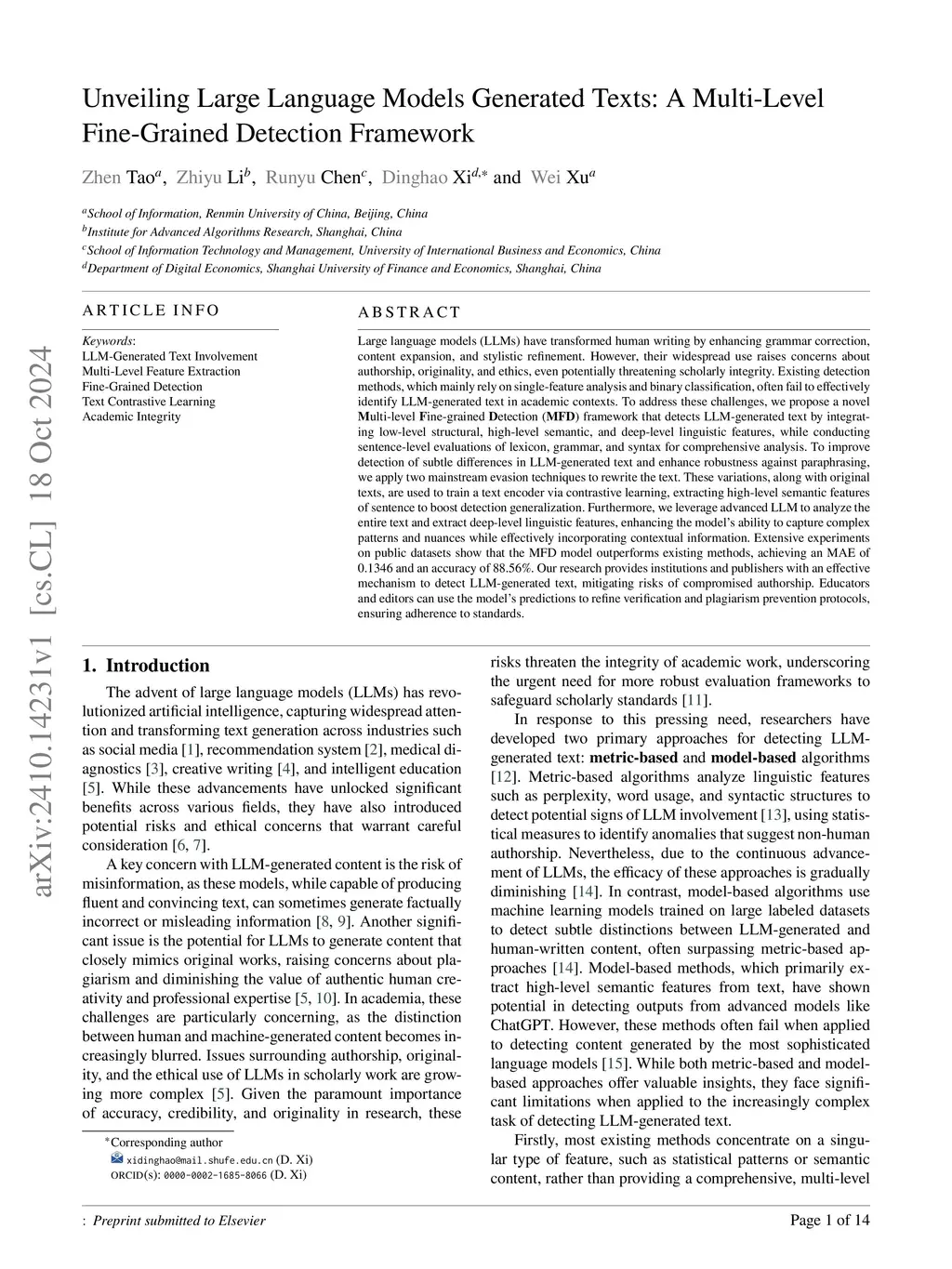 Large language models (LLMs) have transformed human writing by enhancing grammar correction, content expansion, and stylistic refinement. However, their widespread use raises concerns about authorship, originality, and ethics, even potentially threatening scholarly integrity. Existing detection methods, which mainly rely on single-feature analysis and binary classification, often fail to effectively identify LLM-generated text in academic contexts. To address these challenges, we propose a novel Multi-level Fine-grained Detection (MFD) framework that detects LLM-generated text by integrating low-level structural, high-level semantic, and deep-level linguistic features, while conducting sentence-level evaluations of lexicon, grammar, and syntax for comprehensive analysis. To improve detection of subtle differences in LLM-generated text and enhance robustness against paraphrasing, we apply two mainstream evasion techniques to rewrite the text. These variations, along with original texts, are used to train a text encoder via contrastive learning, extracting high-level semantic features of sentence to boost detection generalization. Furthermore, we leverage advanced LLM to analyze the entire text and extract deep-level linguistic features, enhancing the model's ability to capture complex patterns and nuances while effectively incorporating contextual information. Extensive experiments on public datasets show that the MFD model outperforms existing methods, achieving an MAE of 0.1346 and an accuracy of 88.56%. Our research provides institutions and publishers with an effective mechanism to detect LLM-generated text, mitigating risks of compromised authorship. Educators and editors can use the model's predictions to refine verification and plagiarism prevention protocols, ensuring adherence to standards.