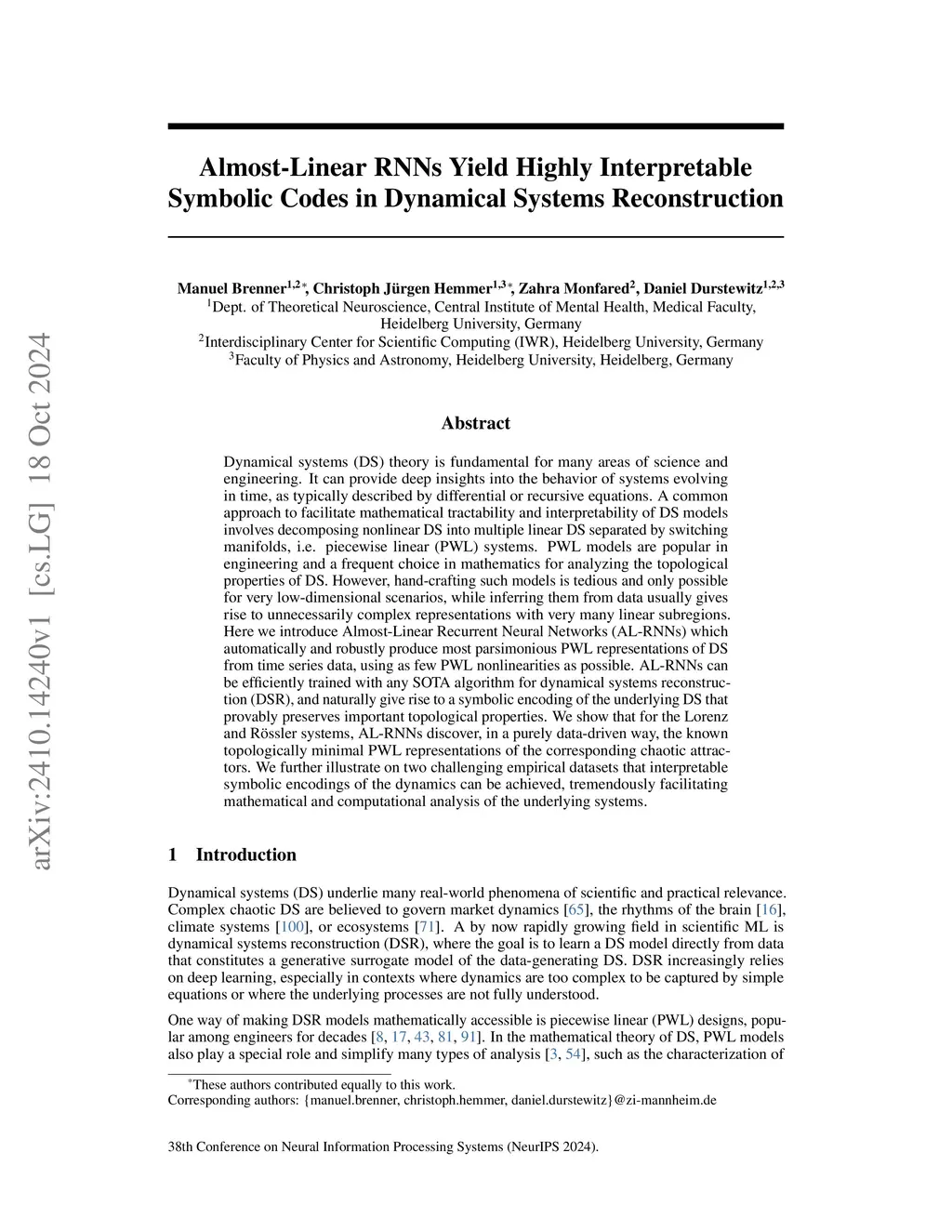Dynamical systems (DS) theory is fundamental for many areas of science and engineering. It can provide deep insights into the behavior of systems evolving in time, as typically described by differential or recursive equations. A common approach to facilitate mathematical tractability and interpretability of DS models involves decomposing nonlinear DS into multiple linear DS separated by switching manifolds, i.e. piecewise linear (PWL) systems. PWL models are popular in engineering and a frequent choice in mathematics for analyzing the topological properties of DS. However, hand-crafting such models is tedious and only possible for very low-dimensional scenarios, while inferring them from data usually gives rise to unnecessarily complex representations with very many linear subregions. Here we introduce Almost-Linear Recurrent Neural Networks (AL-RNNs) which automatically and robustly produce most parsimonious PWL representations of DS from time series data, using as few PWL nonlinearities as possible. AL-RNNs can be efficiently trained with any SOTA algorithm for dynamical systems reconstruction (DSR), and naturally give rise to a symbolic encoding of the underlying DS that provably preserves important topological properties. We show that for the Lorenz and R\"ossler systems, AL-RNNs discover, in a purely data-driven way, the known topologically minimal PWL representations of the corresponding chaotic attractors. We further illustrate on two challenging empirical datasets that interpretable symbolic encodings of the dynamics can be achieved, tremendously facilitating mathematical and computational analysis of the underlying systems.