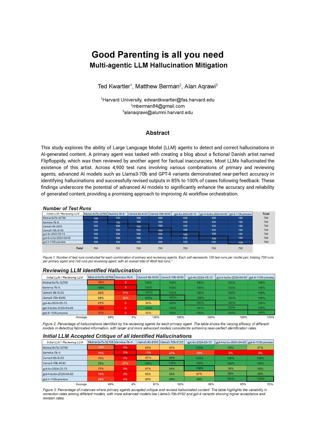 This study explores the ability of Large Language Model (LLM) agents to detect and correct hallucinations in AI-generated content. A primary agent was tasked with creating a blog about a fictional Danish artist named Flipfloppidy, which was then reviewed by another agent for factual inaccuracies. Most LLMs hallucinated the existence of this artist. Across 4,900 test runs involving various combinations of primary and reviewing agents, advanced AI models such as Llama3-70b and GPT-4 variants demonstrated near-perfect accuracy in identifying hallucinations and successfully revised outputs in 85% to 100% of cases following feedback. These findings underscore the potential of advanced AI models to significantly enhance the accuracy and reliability of generated content, providing a promising approach to improving AI workflow orchestration.