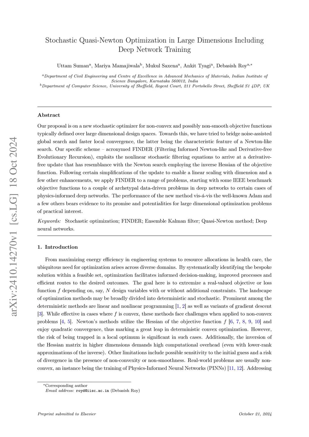 Our proposal is on a new stochastic optimizer for non-convex and possibly non-smooth objective functions typically defined over large dimensional design spaces. Towards this, we have tried to bridge noise-assisted global search and faster local convergence, the latter being the characteristic feature of a Newton-like search. Our specific scheme -- acronymed FINDER (Filtering Informed Newton-like and Derivative-free Evolutionary Recursion), exploits the nonlinear stochastic filtering equations to arrive at a derivative-free update that has resemblance with the Newton search employing the inverse Hessian of the objective function. Following certain simplifications of the update to enable a linear scaling with dimension and a few other enhancements, we apply FINDER to a range of problems, starting with some IEEE benchmark objective functions to a couple of archetypal data-driven problems in deep networks to certain cases of physics-informed deep networks. The performance of the new method vis-á-vis the well-known Adam and a few others bears evidence to its promise and potentialities for large dimensional optimization problems of practical interest.