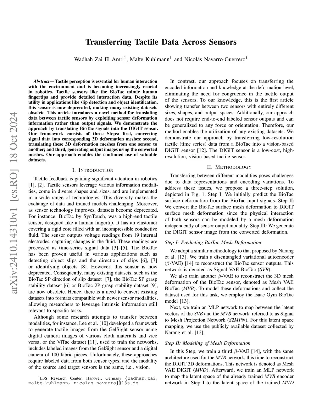 Tactile perception is essential for human interaction with the environment and is becoming increasingly crucial in robotics. Tactile sensors like the BioTac mimic human fingertips and provide detailed interaction data. Despite its utility in applications like slip detection and object identification, this sensor is now deprecated, making many existing datasets obsolete. This article introduces a novel method for translating data between tactile sensors by exploiting sensor deformation information rather than output signals. We demonstrate the approach by translating BioTac signals into the DIGIT sensor. Our framework consists of three steps: first, converting signal data into corresponding 3D deformation meshes; second, translating these 3D deformation meshes from one sensor to another; and third, generating output images using the converted meshes. Our approach enables the continued use of valuable datasets.