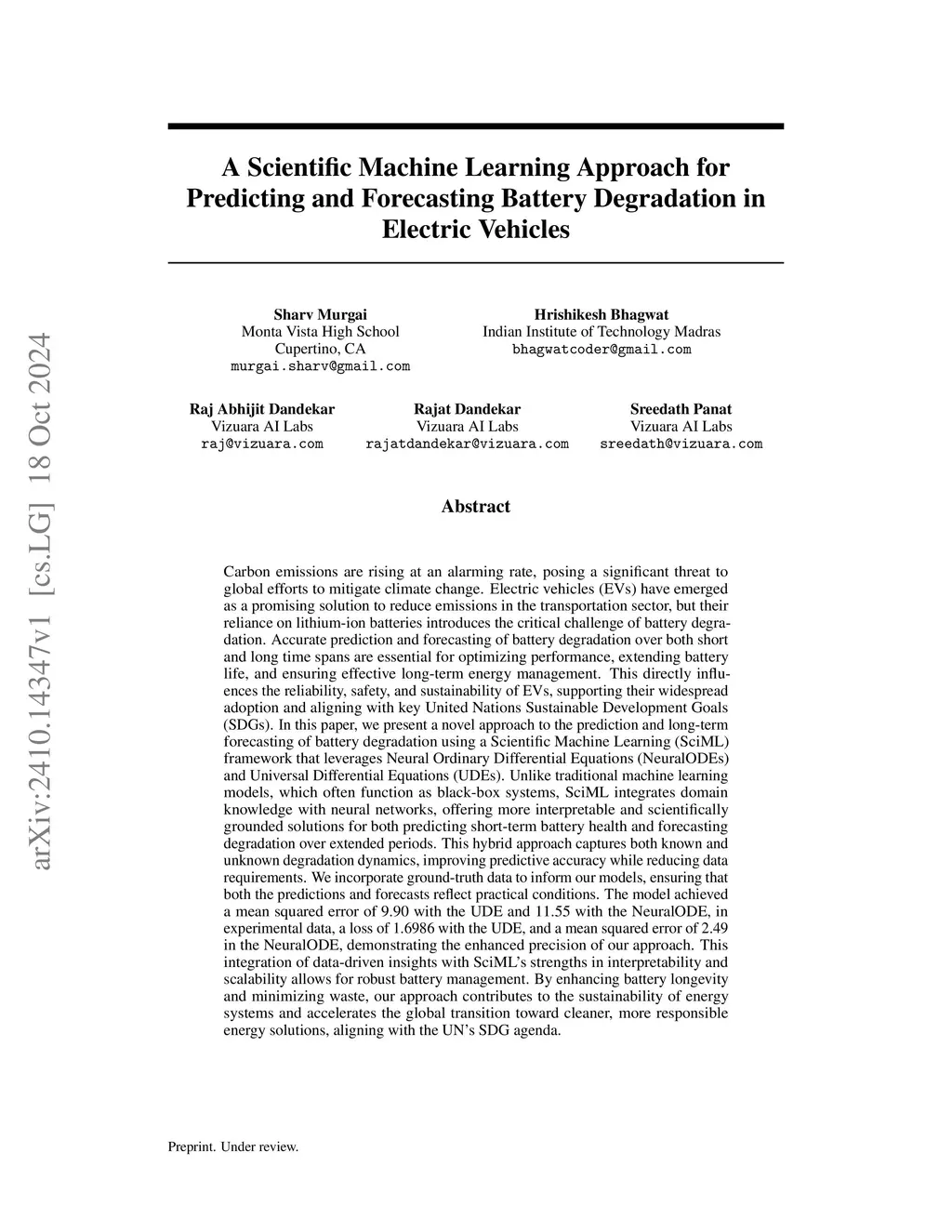 Carbon emissions are rising at an alarming rate, posing a significant threat to global efforts to mitigate climate change. Electric vehicles have emerged as a promising solution, but their reliance on lithium-ion batteries introduces the critical challenge of battery degradation. Accurate prediction and forecasting of battery degradation over both short and long time spans are essential for optimizing performance, extending battery life, and ensuring effective long-term energy management. This directly influences the reliability, safety, and sustainability of EVs, supporting their widespread adoption and aligning with key UN SDGs. In this paper, we present a novel approach to the prediction and long-term forecasting of battery degradation using Scientific Machine Learning framework which integrates domain knowledge with neural networks, offering more interpretable and scientifically grounded solutions for both predicting short-term battery health and forecasting degradation over extended periods. This hybrid approach captures both known and unknown degradation dynamics, improving predictive accuracy while reducing data requirements. We incorporate ground-truth data to inform our models, ensuring that both the predictions and forecasts reflect practical conditions. The model achieved MSE of 9.90 with the UDE and 11.55 with the NeuralODE, in experimental data, a loss of 1.6986 with the UDE, and a MSE of 2.49 in the NeuralODE, demonstrating the enhanced precision of our approach. This integration of data-driven insights with SciML's strengths in interpretability and scalability allows for robust battery management. By enhancing battery longevity and minimizing waste, our approach contributes to the sustainability of energy systems and accelerates the global transition toward cleaner, more responsible energy solutions, aligning with the UN's SDG agenda.