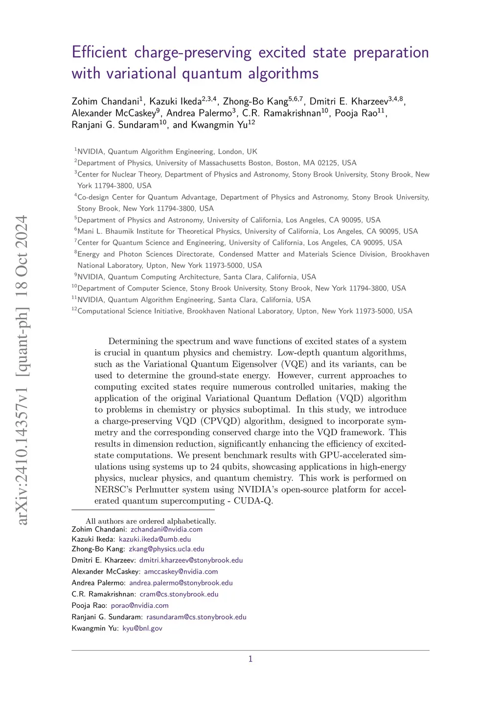 Determining the spectrum and wave functions of excited states of a system is crucial in quantum physics and chemistry. Low-depth quantum algorithms, such as the Variational Quantum Eigensolver (VQE) and its variants, can be used to determine the ground-state energy. However, current approaches to computing excited states require numerous controlled unitaries, making the application of the original Variational Quantum Deflation (VQD) algorithm to problems in chemistry or physics suboptimal. In this study, we introduce a charge-preserving VQD (CPVQD) algorithm, designed to incorporate symmetry and the corresponding conserved charge into the VQD framework. This results in dimension reduction, significantly enhancing the efficiency of excited-state computations. We present benchmark results with GPU-accelerated simulations using systems up to 24 qubits, showcasing applications in high-energy physics, nuclear physics, and quantum chemistry. This work is performed on NERSC's Perlmutter system using NVIDIA's open-source platform for accelerated quantum supercomputing - CUDA-Q.