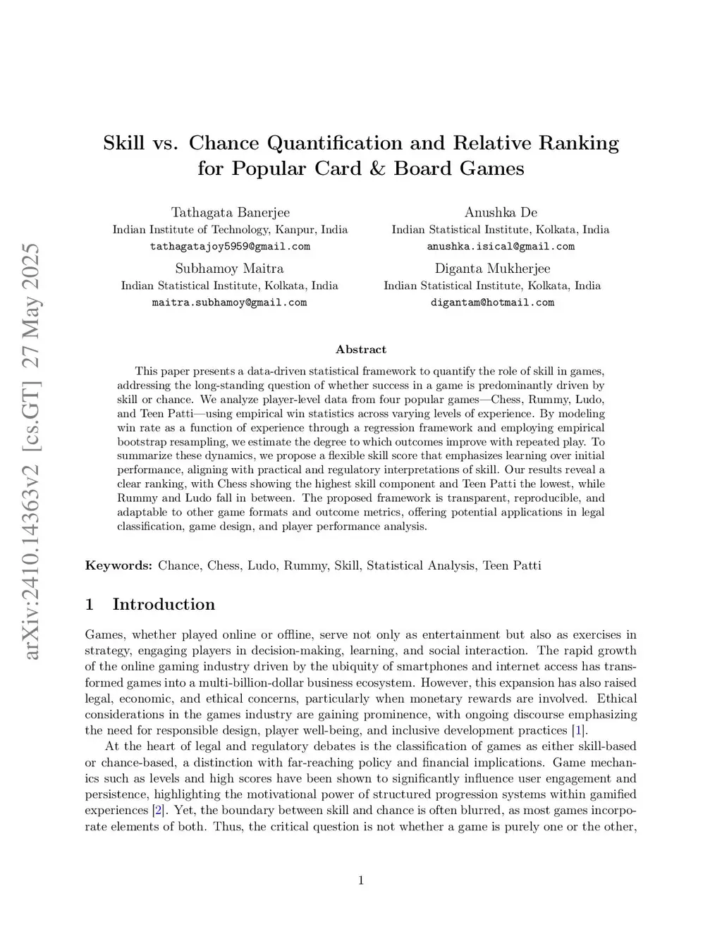 This paper presents a data-driven statistical framework to quantify the role of skill in games, addressing the long-standing question of whether success in a game is predominantly driven by skill or chance. We analyze player level data from four popular games Chess, Rummy, Ludo, and Teen Patti, using empirical win statistics across varying levels of experience. By modeling win rate as a function of experience through a regression framework and employing empirical bootstrap resampling, we estimate the degree to which outcomes improve with repeated play. To summarize these dynamics, we propose a flexible skill score that emphasizes learning over initial performance, aligning with practical and regulatory interpretations of skill. Our results reveal a clear ranking, with Chess showing the highest skill component and Teen Patti the lowest, while Rummy and Ludo fall in between. The proposed framework is transparent, reproducible, and adaptable to other game formats and outcome metrics, offering potential applications in legal classification, game design, and player performance analysis.