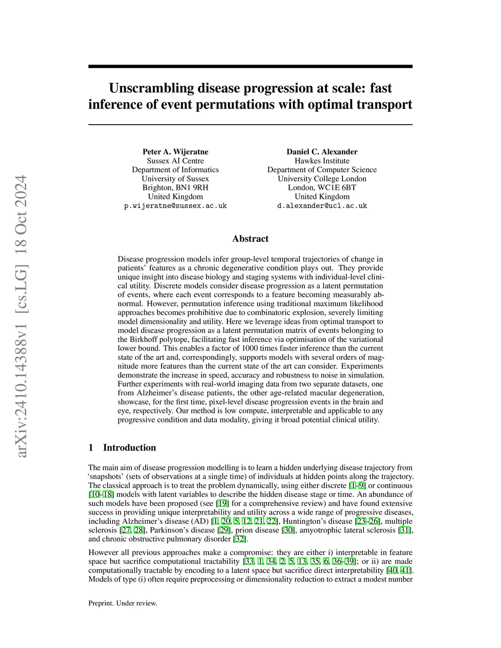 Disease progression models infer group-level temporal trajectories of change in patients' features as a chronic degenerative condition plays out. They provide unique insight into disease biology and staging systems with individual-level clinical utility. Discrete models consider disease progression as a latent permutation of events, where each event corresponds to a feature becoming measurably abnormal. However, permutation inference using traditional maximum likelihood approaches becomes prohibitive due to combinatoric explosion, severely limiting model dimensionality and utility. Here we leverage ideas from optimal transport to model disease progression as a latent permutation matrix of events belonging to the Birkhoff polytope, facilitating fast inference via optimisation of the variational lower bound. This enables a factor of 1000 times faster inference than the current state of the art and, correspondingly, supports models with several orders of magnitude more features than the current state of the art can consider. Experiments demonstrate the increase in speed, accuracy and robustness to noise in simulation. Further experiments with real-world imaging data from two separate datasets, one from Alzheimer's disease patients, the other age-related macular degeneration, showcase, for the first time, pixel-level disease progression events in the brain and eye, respectively. Our method is low compute, interpretable and applicable to any progressive condition and data modality, giving it broad potential clinical utility.