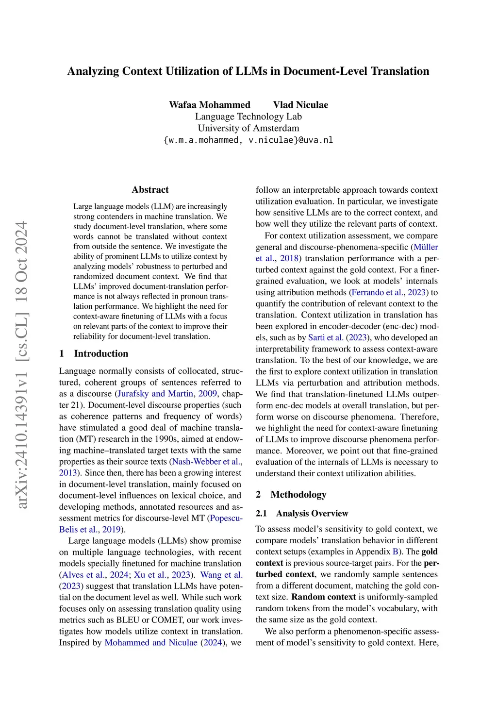 Large language models (LLMs) are increasingly strong contenders in machine translation. In this work, we focus on document-level translation, where some words cannot be translated without context from outside the sentence. Specifically, we investigate the ability of prominent LLMs to utilize the document context during translation through a perturbation analysis (analyzing models' robustness to perturbed and randomized document context) and an attribution analysis (examining the contribution of relevant context to the translation). We conduct an extensive evaluation across nine LLMs from diverse model families and training paradigms, including translation-specialized LLMs, alongside two encoder-decoder transformer baselines. We find that LLMs' improved document-translation performance compared to encoder-decoder models is not reflected in pronoun translation performance. Our analysis highlight the need for context-aware finetuning of LLMs with a focus on relevant parts of the context to improve their reliability for document-level translation.