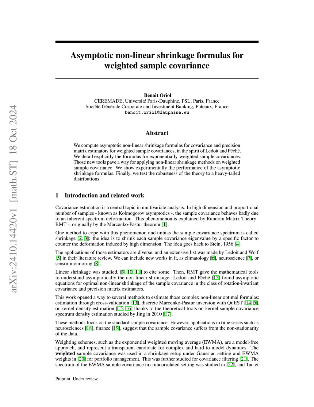 We compute asymptotic non-linear shrinkage formulas for covariance and precision matrix estimators for weighted sample covariances, and the joint sample-population eigenvector overlap distribution, in the spirit of Ledoit and Péché. We detail explicitly the formulas for exponentially-weighted sample covariances. We propose an algorithm to numerically compute those formulas. Experimentally, we show the performance of the asymptotic non-linear shrinkage estimators. Finally, we test the robustness of the theory to a heavy-tailed distributions.