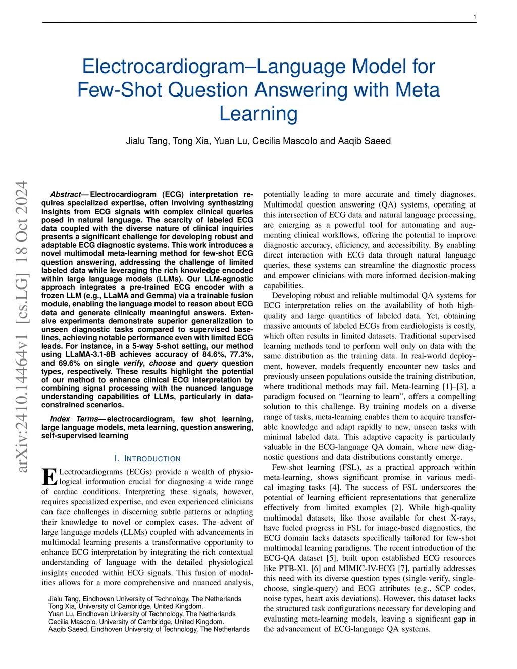Electrocardiogram-Language Model for Few-Shot Question Answering with Meta Learning