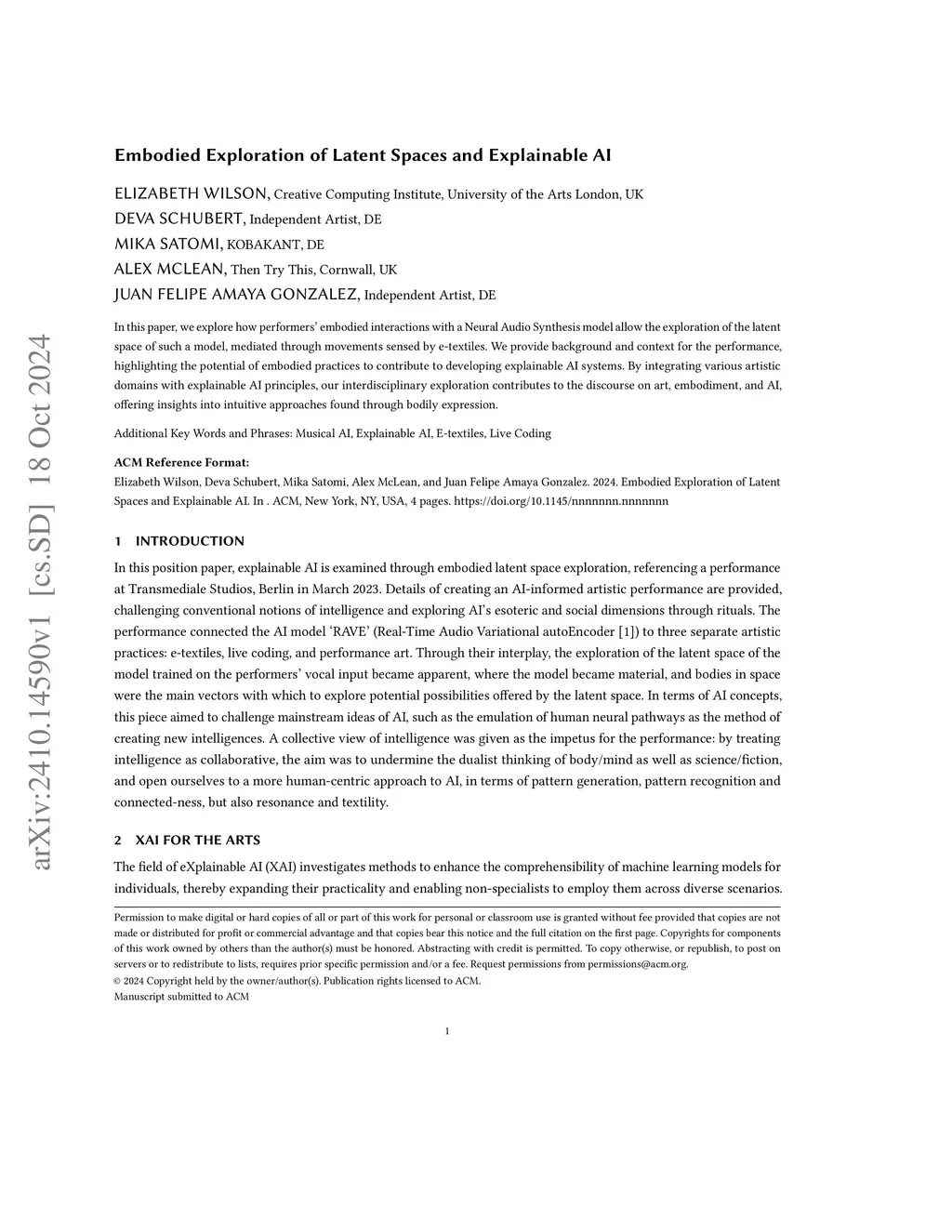 In this paper, we explore how performers' embodied interactions with a Neural Audio Synthesis model allow the exploration of the latent space of such a model, mediated through movements sensed by e-textiles. We provide background and context for the performance, highlighting the potential of embodied practices to contribute to developing explainable AI systems. By integrating various artistic domains with explainable AI principles, our interdisciplinary exploration contributes to the discourse on art, embodiment, and AI, offering insights into intuitive approaches found through bodily expression.