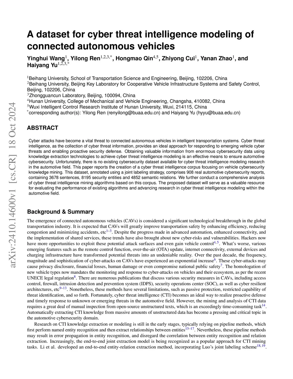 A dataset for cyber threat intelligence modeling of connected autonomous