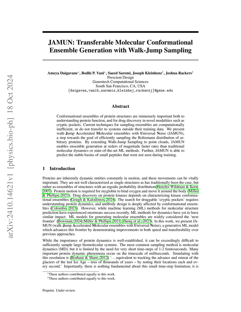 Conformational ensembles of protein structures are immensely important both for understanding protein function and drug discovery in novel modalities such as cryptic pockets. Current techniques for sampling ensembles such as molecular dynamics (MD) are computationally inefficient, while many recent machine learning methods do not transfer to systems outside their training data. We propose JAMUN which performs MD in a smoothed, noised space of all-atom 3D conformations of molecules by utilizing the framework of walk-jump sampling. JAMUN enables ensemble generation for small peptides at rates of an order of magnitude faster than traditional molecular dynamics. The physical priors in JAMUN enables transferability to systems outside of its training data, even to peptides that are longer than those originally trained on. Our model, code and weights are available atthis https URL.