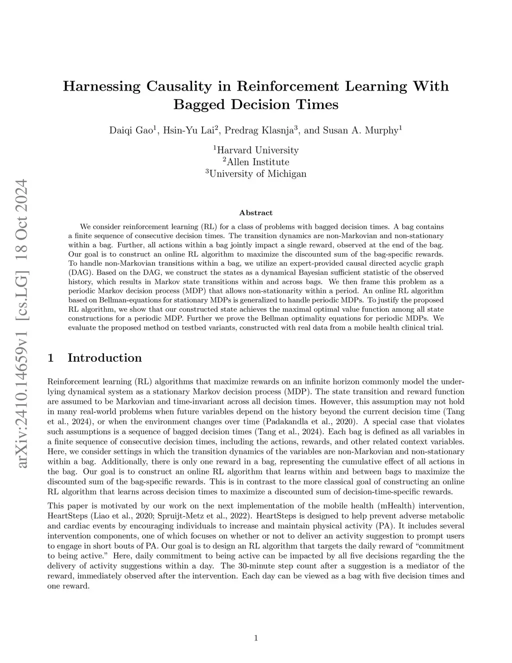 We consider reinforcement learning (RL) for a class of problems with bagged decision times. A bag contains a finite sequence of consecutive decision times. The transition dynamics are non-Markovian and non-stationary within a bag. All actions within a bag jointly impact a single reward, observed at the end of the bag. For example, in mobile health, multiple activity suggestions in a day collectively affect a user's daily commitment to being active. Our goal is to develop an online RL algorithm to maximize the discounted sum of the bag-specific rewards. To handle non-Markovian transitions within a bag, we utilize an expert-provided causal directed acyclic graph (DAG). Based on the DAG, we construct states as a dynamical Bayesian sufficient statistic of the observed history, which results in Markov state transitions within and across bags. We then formulate this problem as a periodic Markov decision process (MDP) that allows non-stationarity within a period. An online RL algorithm based on Bellman equations for stationary MDPs is generalized to handle periodic MDPs. We show that our constructed state achieves the maximal optimal value function among all state constructions for a periodic MDP. Finally, we evaluate the proposed method on testbed variants built from real data in a mobile health clinical trial.