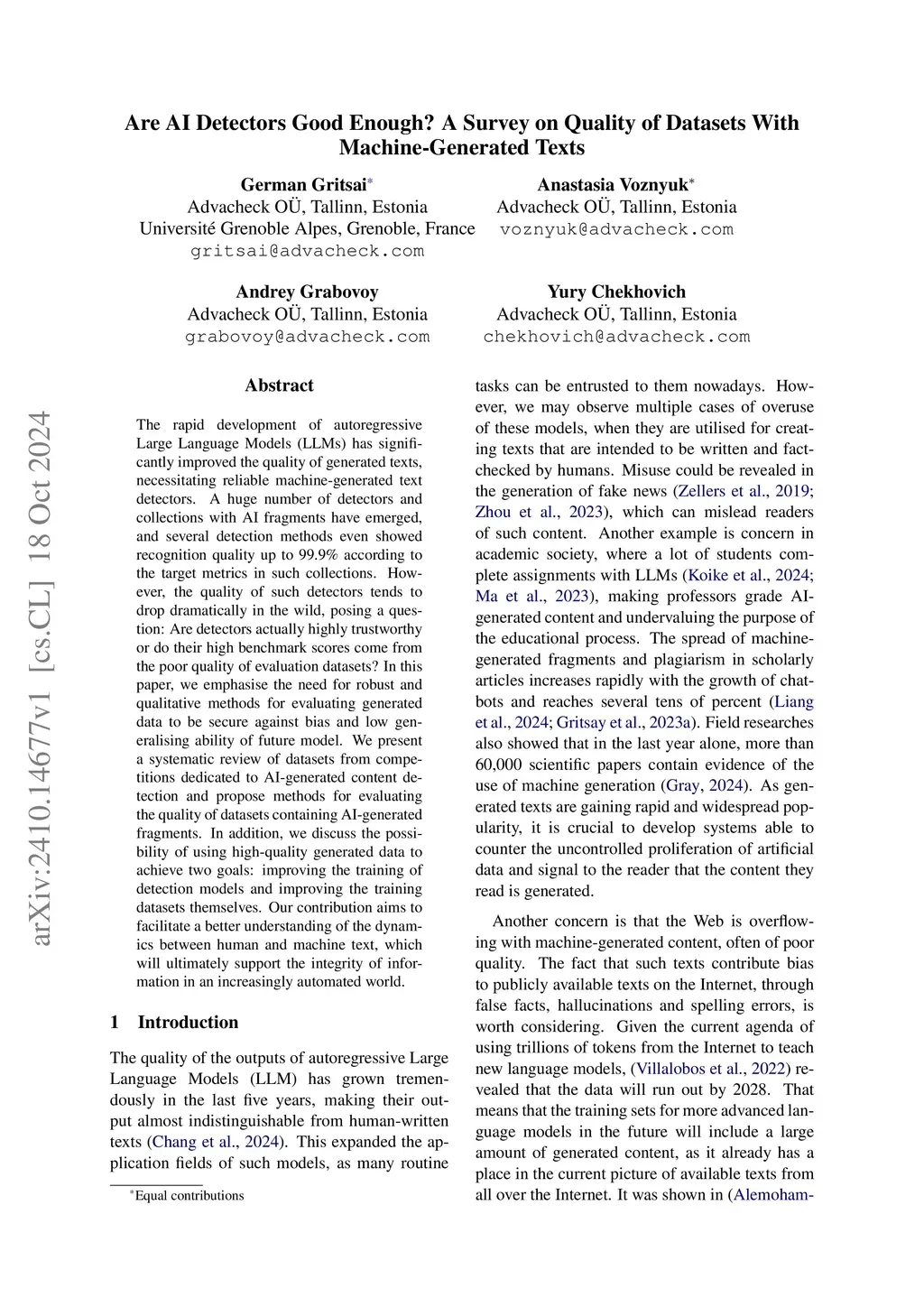 The rapid development of autoregressive Large Language Models (LLMs) has significantly improved the quality of generated texts, necessitating reliable machine-generated text detectors. A huge number of detectors and collections with AI fragments have emerged, and several detection methods even showed recognition quality up to 99.9% according to the target metrics in such collections. However, the quality of such detectors tends to drop dramatically in the wild, posing a question: Are detectors actually highly trustworthy or do their high benchmark scores come from the poor quality of evaluation datasets? In this paper, we emphasise the need for robust and qualitative methods for evaluating generated data to be secure against bias and low generalising ability of future model. We present a systematic review of datasets from competitions dedicated to AI-generated content detection and propose methods for evaluating the quality of datasets containing AI-generated fragments. In addition, we discuss the possibility of using high-quality generated data to achieve two goals: improving the training of detection models and improving the training datasets themselves. Our contribution aims to facilitate a better understanding of the dynamics between human and machine text, which will ultimately support the integrity of information in an increasingly automated world. The code is available atthis https URL.