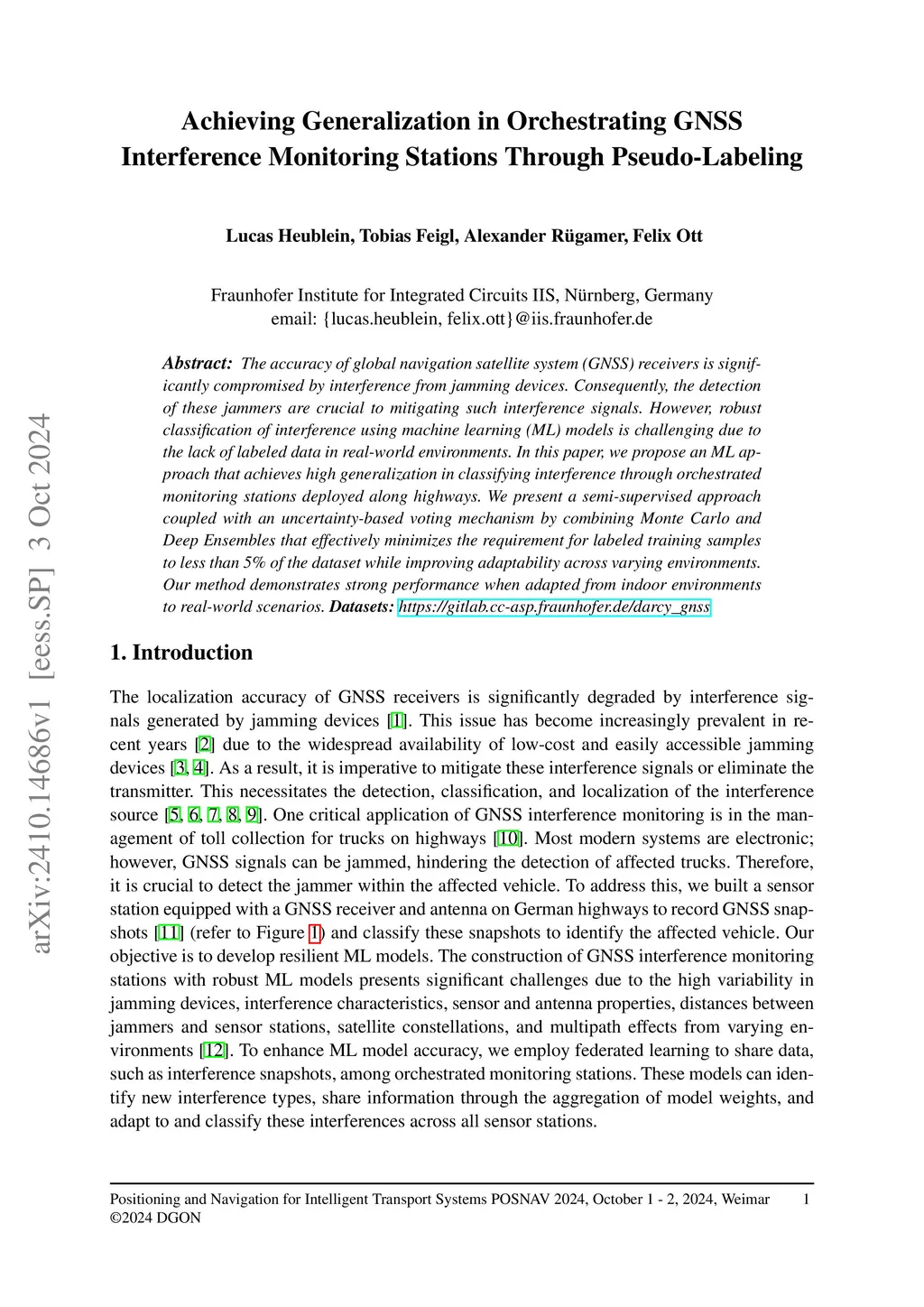 The accuracy of global navigation satellite system (GNSS) receivers is significantly compromised by interference from jamming devices. Consequently, the detection of these jammers are crucial to mitigating such interference signals. However, robust classification of interference using machine learning (ML) models is challenging due to the lack of labeled data in real-world environments. In this paper, we propose an ML approach that achieves high generalization in classifying interference through orchestrated monitoring stations deployed along highways. We present a semi-supervised approach coupled with an uncertainty-based voting mechanism by combining Monte Carlo and Deep Ensembles that effectively minimizes the requirement for labeled training samples to less than 5% of the dataset while improving adaptability across varying environments. Our method demonstrates strong performance when adapted from indoor environments to real-world scenarios.