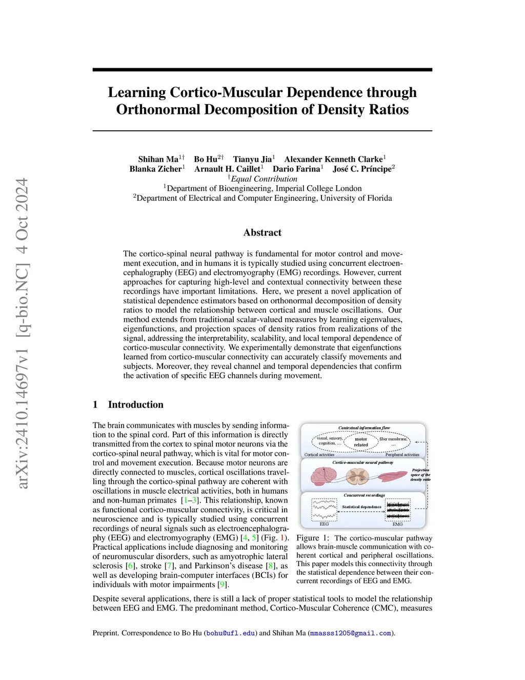 The cortico-spinal neural pathway is fundamental for motor control and movement execution, and in humans it is typically studied using concurrent electroencephalography (EEG) and electromyography (EMG) recordings. However, current approaches for capturing high-level and contextual connectivity between these recordings have important limitations. Here, we present a novel application of statistical dependence estimators based on orthonormal decomposition of density ratios to model the relationship between cortical and muscle oscillations. Our method extends from traditional scalar-valued measures by learning eigenvalues, eigenfunctions, and projection spaces of density ratios from realizations of the signal, addressing the interpretability, scalability, and local temporal dependence of cortico-muscular connectivity. We experimentally demonstrate that eigenfunctions learned from cortico-muscular connectivity can accurately classify movements and subjects. Moreover, they reveal channel and temporal dependencies that confirm the activation of specific EEG channels during movement.
