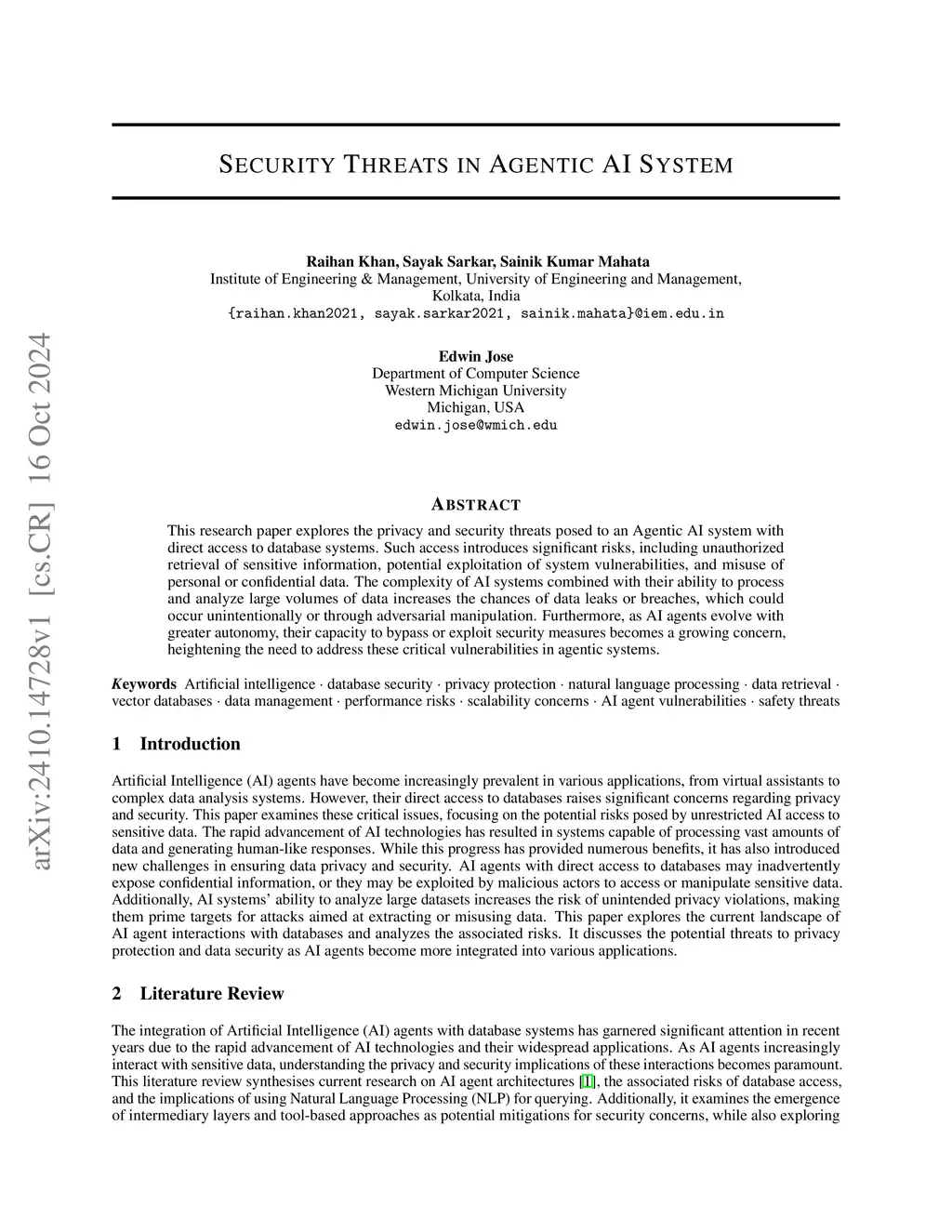 This research paper explores the privacy and security threats posed to an Agentic AI system with direct access to database systems. Such access introduces significant risks, including unauthorized retrieval of sensitive information, potential exploitation of system vulnerabilities, and misuse of personal or confidential data. The complexity of AI systems combined with their ability to process and analyze large volumes of data increases the chances of data leaks or breaches, which could occur unintentionally or through adversarial manipulation. Furthermore, as AI agents evolve with greater autonomy, their capacity to bypass or exploit security measures becomes a growing concern, heightening the need to address these critical vulnerabilities in agentic systems.