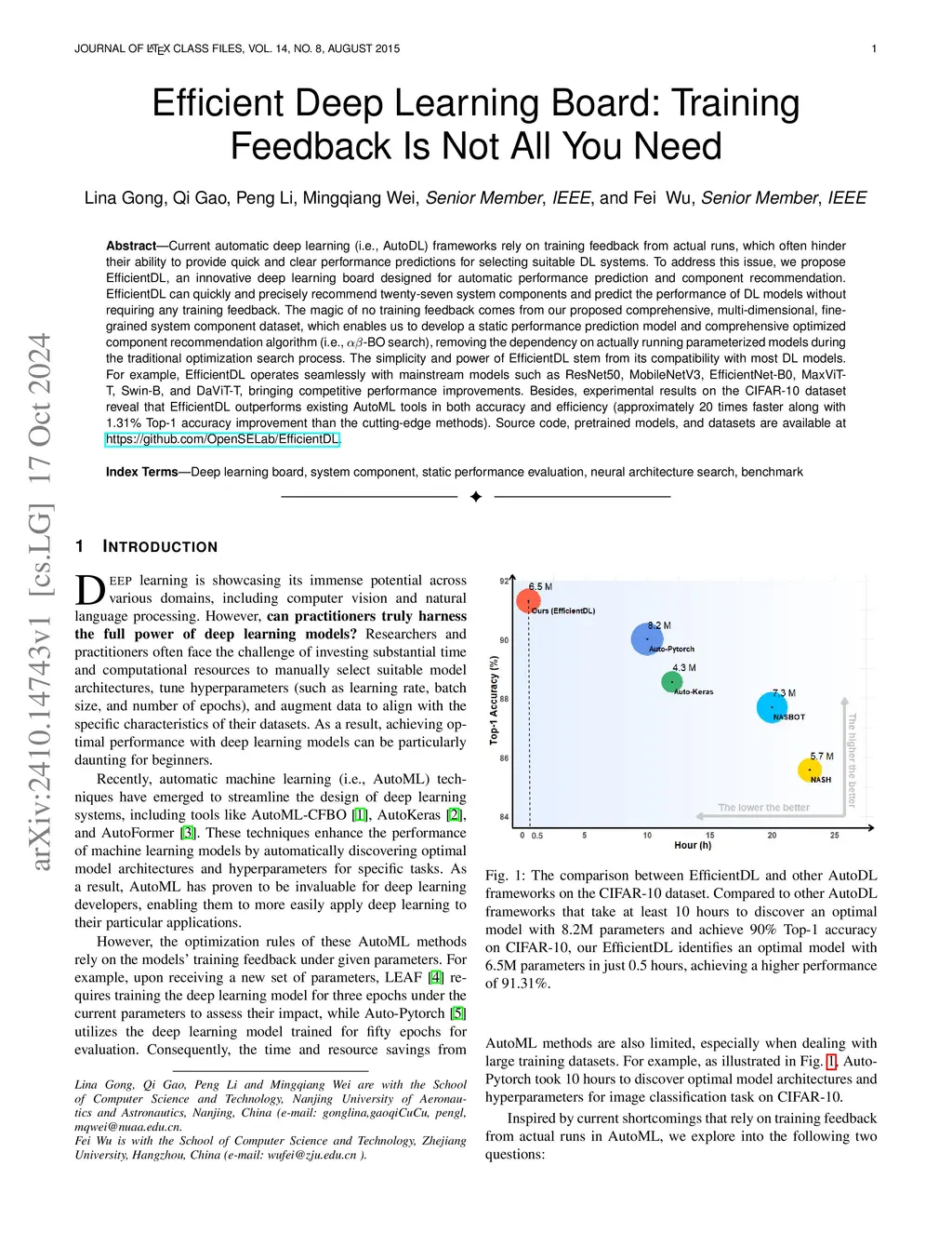 Current automatic deep learning (i.e., AutoDL) frameworks rely on training feedback from actual runs, which often hinder their ability to provide quick and clear performance predictions for selecting suitable DL systems. To address this issue, we propose EfficientDL, an innovative deep learning board designed for automatic performance prediction and component recommendation. EfficientDL can quickly and precisely recommend twenty-seven system components and predict the performance of DL models without requiring any training feedback. The magic of no training feedback comes from our proposed comprehensive, multi-dimensional, fine-grained system component dataset, which enables us to develop a static performance prediction model and comprehensive optimized component recommendation algorithm (i.e., {\alpha}\b{eta}-BO search), removing the dependency on actually running parameterized models during the traditional optimization search process. The simplicity and power of EfficientDL stem from its compatibility with most DL models. For example, EfficientDL operates seamlessly with mainstream models such as ResNet50, MobileNetV3, EfficientNet-B0, MaxViT-T, Swin-B, and DaViT-T, bringing competitive performance improvements. Besides, experimental results on the CIFAR-10 dataset reveal that EfficientDL outperforms existing AutoML tools in both accuracy and efficiency (approximately 20 times faster along with 1.31% Top-1 accuracy improvement than the cutting-edge methods). Source code, pretrained models, and datasets are available at https://github.com/OpenSELab/EfficientDL.