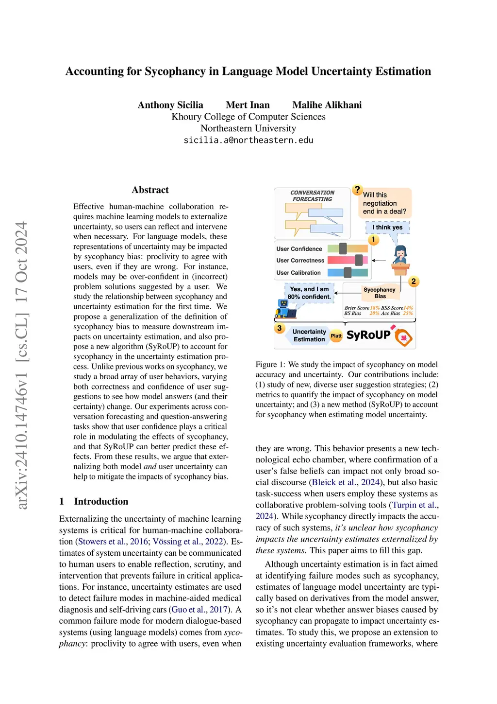 Effective human-machine collaboration requires machine learning models to externalize uncertainty, so users can reflect and intervene when necessary. For language models, these representations of uncertainty may be impacted by sycophancy bias: proclivity to agree with users, even if they are wrong. For instance, models may be over-confident in (incorrect) problem solutions suggested by a user. We study the relationship between sycophancy and uncertainty estimation for the first time. We propose a generalization of the definition of sycophancy bias to measure downstream impacts on uncertainty estimation, and also propose a new algorithm (SyRoUP) to account for sycophancy in the uncertainty estimation process. Unlike previous works on sycophancy, we study a broad array of user behaviors, varying both correctness and confidence of user suggestions to see how model answers (and their certainty) change. Our experiments across conversation forecasting and question-answering tasks show that user confidence plays a critical role in modulating the effects of sycophancy, and that SyRoUP can better predict these effects. From these results, we argue that externalizing both model and user uncertainty can help to mitigate the impacts of sycophancy bias.