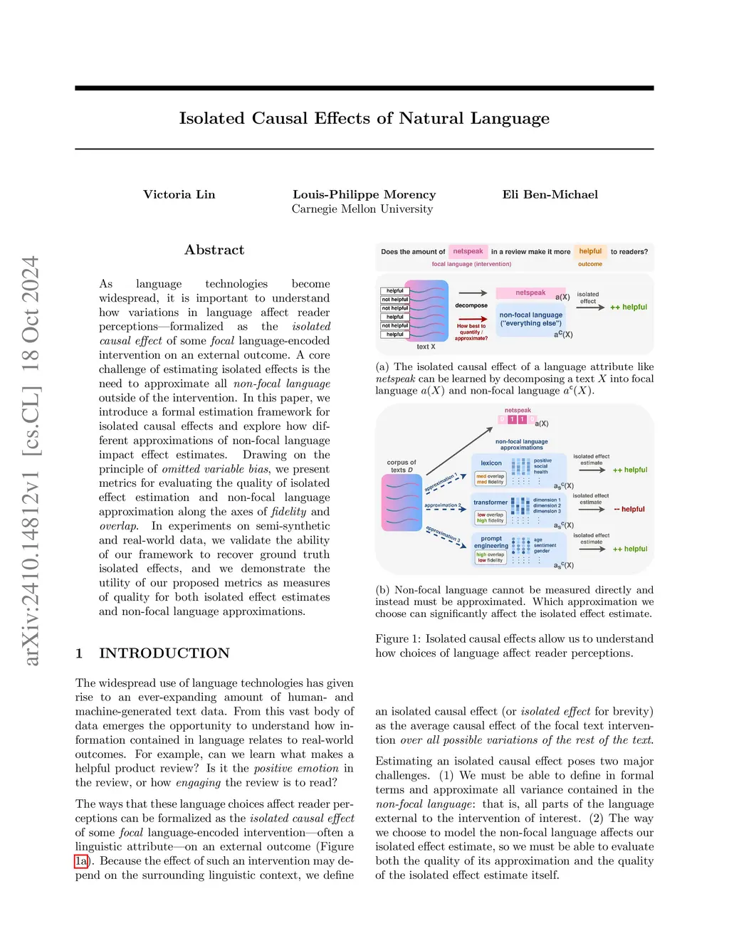 As language technologies become widespread, it is important to understand how changes in language affect reader perceptions and behaviors. These relationships may be formalized as the isolated causal effect of some focal language-encoded intervention (e.g., factual inaccuracies) on an external outcome (e.g., readers' beliefs). In this paper, we introduce a formal estimation framework for isolated causal effects of language. We show that a core challenge of estimating isolated effects is the need to approximate all non-focal language outside of the intervention. Drawing on the principle of omitted variable bias, we provide measures for evaluating the quality of both non-focal language approximations and isolated effect estimates themselves. We find that poor approximation of non-focal language can lead to bias in the corresponding isolated effect estimates due to omission of relevant variables, and we show how to assess the sensitivity of effect estimates to such bias along the two key axes of fidelity and overlap. In experiments on semi-synthetic and real-world data, we validate the ability of our framework to correctly recover isolated effects and demonstrate the utility of our proposed measures.