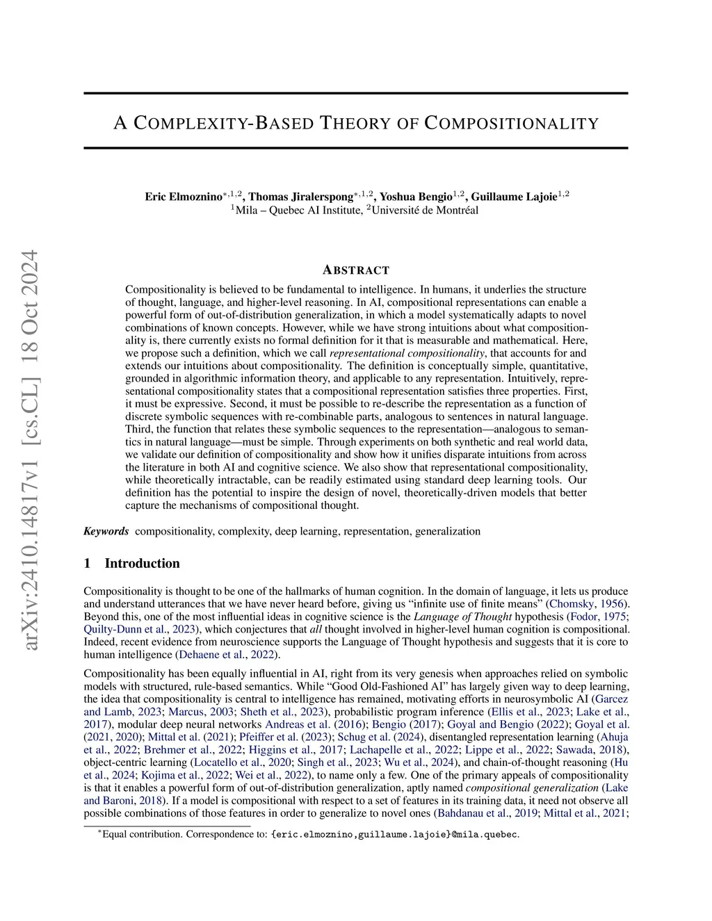 Compositionality is believed to be fundamental to intelligence. In humans, it underlies the structure of thought, language, and higher-level reasoning. In AI, compositional representations can enable a powerful form of out-of-distribution generalization, in which a model systematically adapts to novel combinations of known concepts. However, while we have strong intuitions about what compositionality is, we lack satisfying formal definitions for it that are measurable and mathematical. Here, we propose such a definition, which we call representational compositionality, that accounts for and extends our intuitions about compositionality. The definition is conceptually simple, quantitative, grounded in algorithmic information theory, and applicable to any representation. Intuitively, representational compositionality states that a compositional representation satisfies three properties. First, it must be expressive. Second, it must be possible to re-describe the representation as a function of discrete symbolic sequences with re-combinable parts, analogous to sentences in natural language. Third, the function that relates these symbolic sequences to the representation, analogous to semantics in natural language, must be simple. Through experiments on both synthetic and real world data, we validate our definition of compositionality and show how it unifies disparate intuitions from across the literature in both AI and cognitive science. We also show that representational compositionality, while theoretically intractable, can be readily estimated using standard deep learning tools. We hope that our definition can inspire the design of novel, theoretically-driven models that better capture the mechanisms of compositional thought. We make our code available atthis https URL.