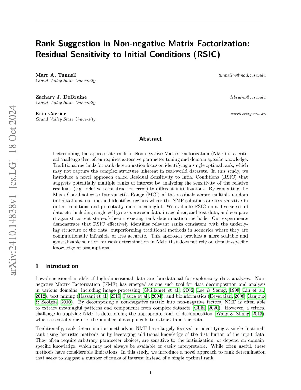 Determining the appropriate rank in Non-negative Matrix Factorization (NMF) is a critical challenge that often requires extensive parameter tuning and domain-specific knowledge. Traditional methods for rank determination focus on identifying a single optimal rank, which may not capture the complex structure inherent in real-world datasets. In this study, we introduce a novel approach called Residual Sensitivity to Intial Conditions (RSIC) that suggests potentially multiple ranks of interest by analyzing the sensitivity of the relative residuals (e.g. relative reconstruction error) to different initializations. By computing the Mean Coordinatewise Interquartile Range (MCI) of the residuals across multiple random initializations, our method identifies regions where the NMF solutions are less sensitive to initial conditions and potentially more meaningful. We evaluate RSIC on a diverse set of datasets, including single-cell gene expression data, image data, and text data, and compare it against current state-of-the-art existing rank determination methods. Our experiments demonstrate that RSIC effectively identifies relevant ranks consistent with the underlying structure of the data, outperforming traditional methods in scenarios where they are computationally infeasible or less accurate. This approach provides a more scalable and generalizable solution for rank determination in NMF that does not rely on domain-specific knowledge or assumptions.