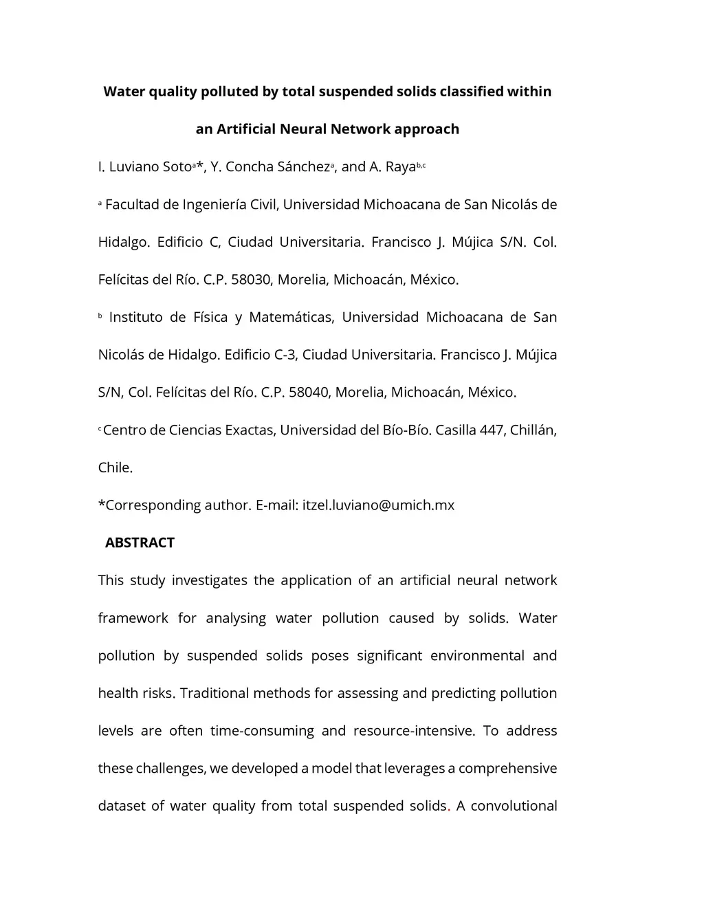 This study investigates the application of an artificial neural network framework for analysing water pollution caused by solids. Water pollution by suspended solids poses significant environmental and health risks. Traditional methods for assessing and predicting pollution levels are often time-consuming and resource-intensive. To address these challenges, we developed a model that leverages a comprehensive dataset of water quality from total suspended solids. A convolutional neural network was trained under a transfer learning approach using data corresponding to different total suspended solids concentrations, with the goal of accurately predicting low, medium and high pollution levels based on various input variables. Our model demonstrated high predictive accuracy, outperforming conventional statistical methods in terms of both speed and reliability. The results suggest that the artificial neural network framework can serve as an effective tool for real-time monitoring and management of water pollution, facilitating proactive decision-making and policy formulation. This approach not only enhances our understanding of pollution dynamics but also underscores the potential of machine learning techniques in environmental science.