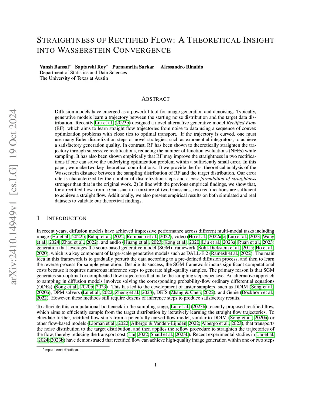Diffusion models have emerged as a powerful tool for image generation and denoising. Typically, generative models learn a trajectory between the starting noise distribution and the target data distribution. Recently Liu et al. (2023b) designed a novel alternative generative model Rectified Flow (RF), which aims to learn straight flow trajectories from noise to data using a sequence of convex optimization problems with close ties to optimal transport. If the trajectory is curved, one must use many Euler discretization steps or novel strategies, such as exponential integrators, to achieve a satisfactory generation quality. In contrast, RF has been shown to theoretically straighten the trajectory through successive rectifications, reducing the number of function evaluations (NFEs) while sampling. It has also been shown empirically that RF may improve the straightness in two rectifications if one can solve the underlying optimization problem within a sufficiently small error. In this paper, we make two key theoretical contributions: 1) we provide the first theoretical analysis of the Wasserstein distance between the sampling distribution of RF and the target distribution. Our error rate is characterized by the number of discretization steps and a \textit{new formulation of straightness} stronger than that in the original work. 2) under a mild regularity assumption, we show that for a rectified flow from a Gaussian to any general target distribution with finite first moment (e.g. mixture of Gaussians), two rectifications are sufficient to achieve a straight flow, which is in line with the previous empirical findings. Additionally, we also present empirical results on both simulated and real datasets to validate our theoretical findings.
