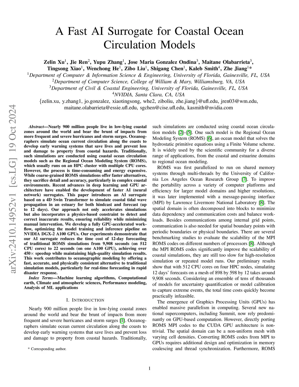 Nearly 900 million people live in low-lying coastal zones around the world and bear the brunt of impacts from more frequent and severe hurricanes and storm surges. Oceanographers simulate ocean current circulation along the coasts to develop early warning systems that save lives and prevent loss and damage to property from coastal hazards. Traditionally, such simulations are conducted using coastal ocean circulation models such as the Regional Ocean Modeling System (ROMS), which usually runs on an HPC cluster with multiple CPU cores. However, the process is time-consuming and energy expensive. While coarse-grained ROMS simulations offer faster alternatives, they sacrifice detail and accuracy, particularly in complex coastal environments. Recent advances in deep learning and GPU architecture have enabled the development of faster AI (neural network) surrogates. This paper introduces an AI surrogate based on a 4D Swin Transformer to simulate coastal tidal wave propagation in an estuary for both hindcast and forecast (up to 12 days). Our approach not only accelerates simulations but also incorporates a physics-based constraint to detect and correct inaccurate results, ensuring reliability while minimizing manual intervention. We develop a fully GPU-accelerated workflow, optimizing the model training and inference pipeline on NVIDIA DGX-2 A100 GPUs. Our experiments demonstrate that our AI surrogate reduces the time cost of 12-day forecasting of traditional ROMS simulations from 9,908 seconds (on 512 CPU cores) to 22 seconds (on one A100 GPU), achieving over 450 speedup while maintaining high-quality simulation results. This work contributes to oceanographic modeling by offering a fast, accurate, and physically consistent alternative to traditional simulation models, particularly for real-time forecasting in rapid disaster response.