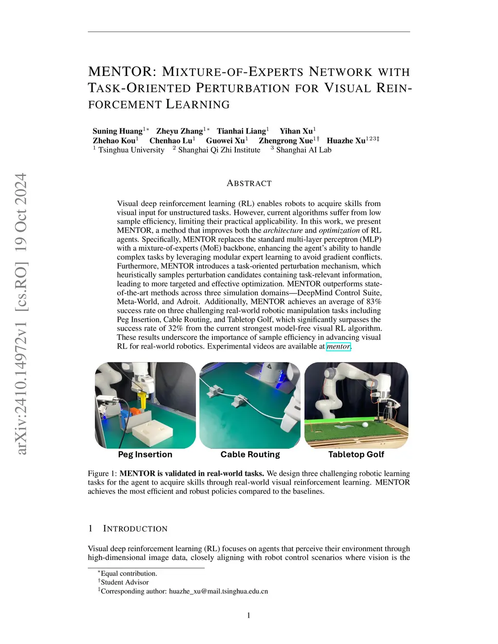 Visual deep reinforcement learning (RL) enables robots to acquire skills from visual input for unstructured tasks. However, current algorithms suffer from low sample efficiency, limiting their practical applicability. In this work, we present MENTOR, a method that improves both the architecture and optimization of RL agents. Specifically, MENTOR replaces the standard multi-layer perceptron (MLP) with a mixture-of-experts (MoE) backbone and introduces a task-oriented perturbation mechanism. MENTOR outperforms state-of-the-art methods across three simulation benchmarks and achieves an average of 83% success rate on three challenging real-world robotic manipulation tasks, significantly surpassing the 32% success rate of the strongest existing model-free visual RL algorithm. These results underscore the importance of sample efficiency in advancing visual RL for real-world robotics. Experimental videos are available atthis https URL.