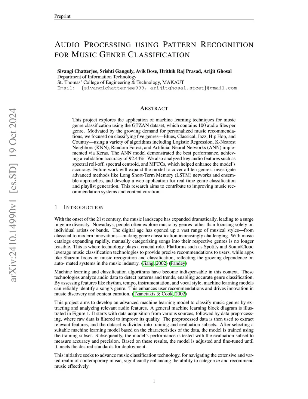 This project explores the application of machine learning techniques for music genre classification using the GTZAN dataset, which contains 100 audio files per genre. Motivated by the growing demand for personalized music recommendations, we focused on classifying five genres-Blues, Classical, Jazz, Hip Hop, and Country-using a variety of algorithms including Logistic Regression, K-Nearest Neighbors (KNN), Random Forest, and Artificial Neural Networks (ANN) implemented via Keras. The ANN model demonstrated the best performance, achieving a validation accuracy of 92.44%. We also analyzed key audio features such as spectral roll-off, spectral centroid, and MFCCs, which helped enhance the model's accuracy. Future work will expand the model to cover all ten genres, investigate advanced methods like Long Short-Term Memory (LSTM) networks and ensemble approaches, and develop a web application for real-time genre classification and playlist generation. This research aims to contribute to improving music recommendation systems and content curation.