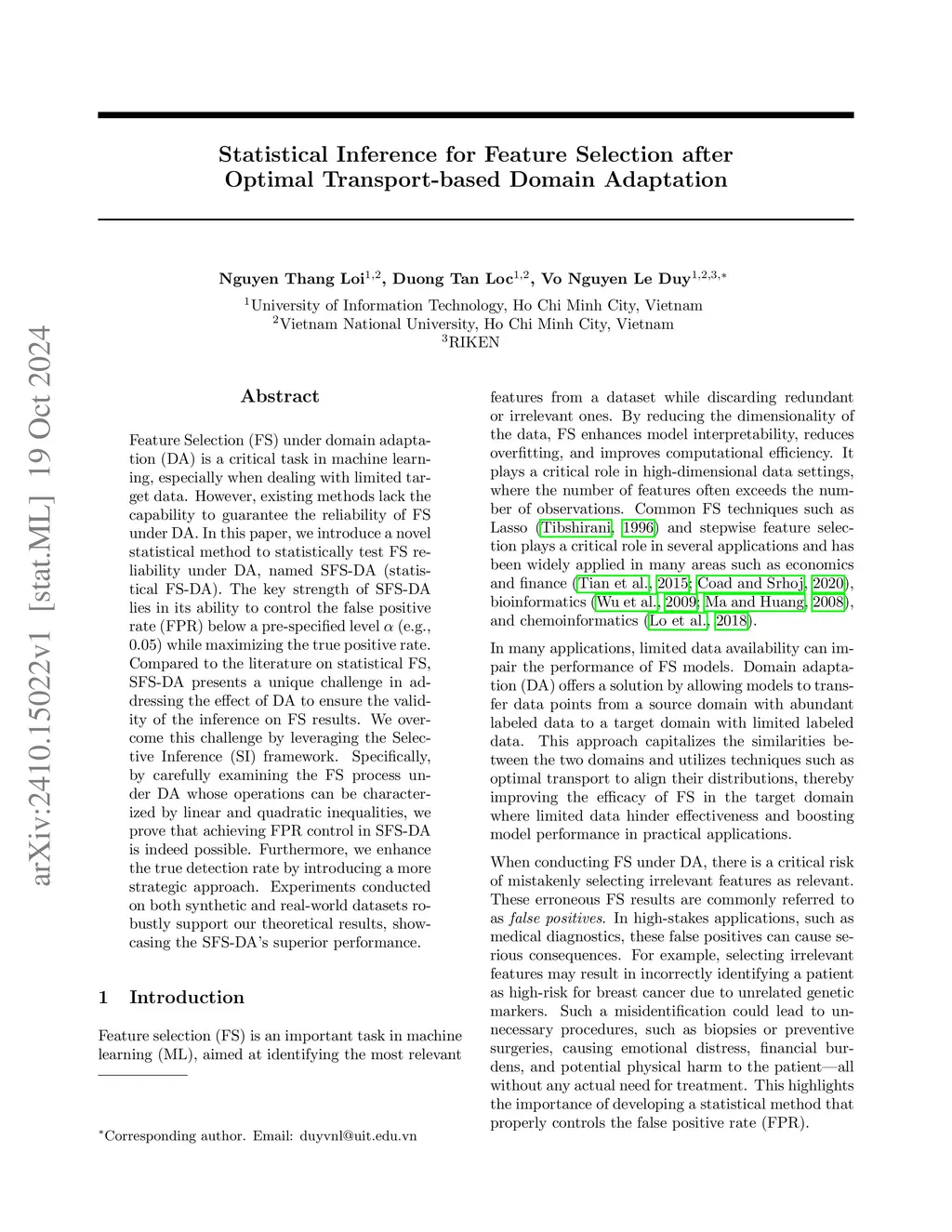 Feature Selection (FS) under domain adaptation (DA) is a critical task in machine learning, especially when dealing with limited target data. However, existing methods lack the capability to guarantee the reliability of FS under DA. In this paper, we introduce a novel statistical method to statistically test FS reliability under DA, named SFS-DA (statistical FS-DA). The key strength of SFS-DA lies in its ability to control the false positive rate (FPR) below a pre-specified level (e.g., 0.05) while maximizing the true positive rate. Compared to the literature on statistical FS, SFS-DA presents a unique challenge in addressing the effect of DA to ensure the validity of the inference on FS results. We overcome this challenge by leveraging the Selective Inference (SI) framework. Specifically, by carefully examining the FS process under DA whose operations can be characterized by linear and quadratic inequalities, we prove that achieving FPR control in SFS-DA is indeed possible. Furthermore, we enhance the true detection rate by introducing a more strategic approach. Experiments conducted on both synthetic and real-world datasets robustly support our theoretical results, showcasing the superior performance of the proposed SFS-DA method.