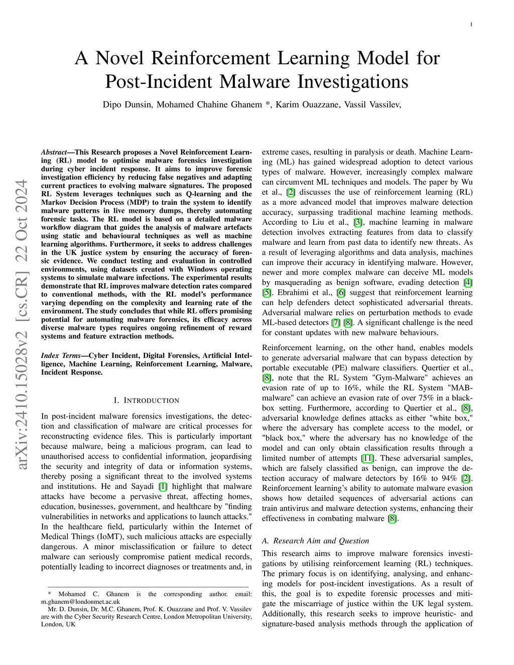 This Research proposes a Novel Reinforcement Learning (RL) model to optimise malware forensics investigation during cyber incident response. It aims to improve forensic investigation efficiency by reducing false negatives and adapting current practices to evolving malware signatures. The proposed RL framework leverages techniques such as Q-learning and the Markov Decision Process (MDP) to train the system to identify malware patterns in live memory dumps, thereby automating forensic tasks. The RL model is based on a detailed malware workflow diagram that guides the analysis of malware artefacts using static and behavioural techniques as well as machine learning algorithms. Furthermore, it seeks to address challenges in the UK justice system by ensuring the accuracy of forensic evidence. We conduct testing and evaluation in controlled environments, using datasets created with Windows operating systems to simulate malware infections. The experimental results demonstrate that RL improves malware detection rates compared to conventional methods, with the RL model's performance varying depending on the complexity and learning rate of the environment. The study concludes that while RL offers promising potential for automating malware forensics, its efficacy across diverse malware types requires ongoing refinement of reward systems and feature extraction methods.