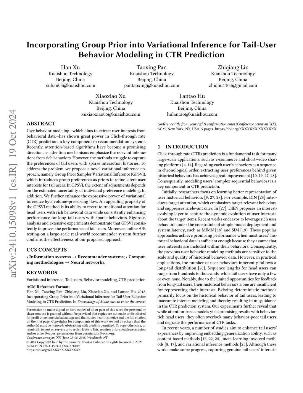 User behavior modeling -- which aims to extract user interests from behavioral data -- has shown great power in Click-through rate (CTR) prediction, a key component in recommendation systems. Recently, attention-based algorithms have become a promising direction, as attention mechanisms emphasize the relevant interactions from rich behaviors. However, the methods struggle to capture the preferences of tail users with sparse interaction histories. To address the problem, we propose a novel variational inference approach, namely Group Prior Sampler Variational Inference (GPSVI), which introduces group preferences as priors to refine latent user interests for tail users. In GPSVI, the extent of adjustments depends on the estimated uncertainty of individual preference modeling. In addition, We further enhance the expressive power of variational inference by a volume-preserving flow. An appealing property of the GPSVI method is its ability to revert to traditional attention for head users with rich behavioral data while consistently enhancing performance for long-tail users with sparse behaviors. Rigorous analysis and extensive experiments demonstrate that GPSVI consistently improves the performance of tail users. Moreover, online A/B testing on a large-scale real-world recommender system further confirms the effectiveness of our proposed approach.