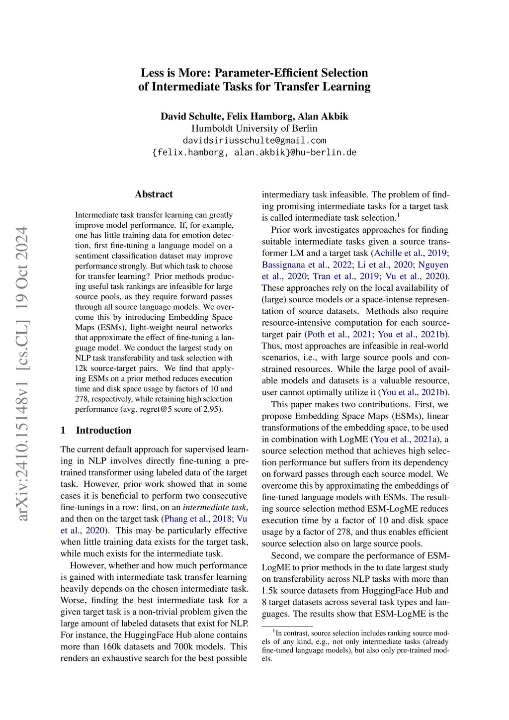 Intermediate task transfer learning can greatly improve model performance. If, for example, one has little training data for emotion detection, first fine-tuning a language model on a sentiment classification dataset may improve performance strongly. But which task to choose for transfer learning? Prior methods producing useful task rankings are infeasible for large source pools, as they require forward passes through all source language models. We overcome this by introducing Embedding Space Maps (ESMs), light-weight neural networks that approximate the effect of fine-tuning a language model. We conduct the largest study on NLP task transferability and task selection with 12k source-target pairs. We find that applying ESMs on a prior method reduces execution time and disk space usage by factors of 10 and 278, respectively, while retaining high selection performance (avg. regret@5 score of 2.95).