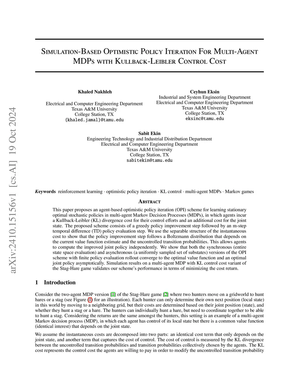 This paper proposes an agent-based optimistic policy iteration (OPI) scheme for learning stationary optimal stochastic policies in multi-agent Markov Decision Processes (MDPs), in which agents incur a Kullback-Leibler (KL) divergence cost for their control efforts and an additional cost for the joint state. The proposed scheme consists of a greedy policy improvement step followed by an m-step temporal difference (TD) policy evaluation step. We use the separable structure of the instantaneous cost to show that the policy improvement step follows a Boltzmann distribution that depends on the current value function estimate and the uncontrolled transition probabilities. This allows agents to compute the improved joint policy independently. We show that both the synchronous (entire state space evaluation) and asynchronous (a uniformly sampled set of substates) versions of the OPI scheme with finite policy evaluation rollout converge to the optimal value function and an optimal joint policy asymptotically. Simulation results on a multi-agent MDP with KL control cost variant of the Stag-Hare game validates our scheme's performance in terms of minimizing the cost return.