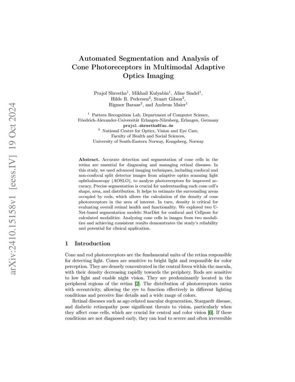 Accurate detection and segmentation of cone cells in the retina are essential for diagnosing and managing retinal diseases. In this study, we used advanced imaging techniques, including confocal and non-confocal split detector images from adaptive optics scanning light ophthalmoscopy (AOSLO), to analyze photoreceptors for improved accuracy. Precise segmentation is crucial for understanding each cone cell's shape, area, and distribution. It helps to estimate the surrounding areas occupied by rods, which allows the calculation of the density of cone photoreceptors in the area of interest. In turn, density is critical for evaluating overall retinal health and functionality. We explored two U-Net-based segmentation models: StarDist for confocal and Cellpose for calculated modalities. Analyzing cone cells in images from two modalities and achieving consistent results demonstrates the study's reliability and potential for clinical application.