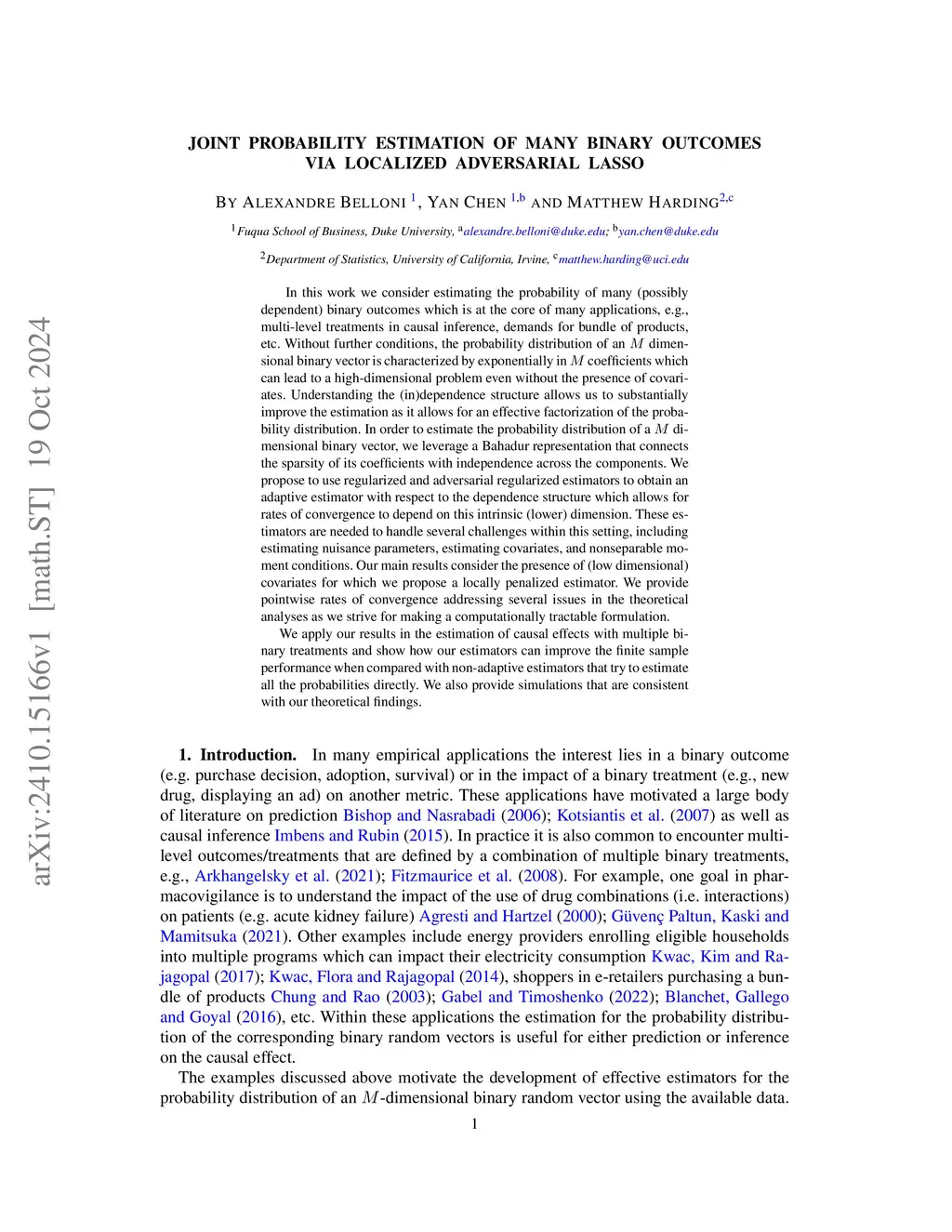In this work we consider estimating the probability of many (possibly dependent) binary outcomes which is at the core of many applications, e.g., multi-level treatments in causal inference, demands for bundle of products, etc. Without further conditions, the probability distribution of an M dimensional binary vector is characterized by exponentially in M coefficients which can lead to a high-dimensional problem even without the presence of covariates. Understanding the (in)dependence structure allows us to substantially improve the estimation as it allows for an effective factorization of the probability distribution. In order to estimate the probability distribution of a M dimensional binary vector, we leverage a Bahadur representation that connects the sparsity of its coefficients with independence across the components. We propose to use regularized and adversarial regularized estimators to obtain an adaptive estimator with respect to the dependence structure which allows for rates of convergence to depend on this intrinsic (lower) dimension. These estimators are needed to handle several challenges within this setting, including estimating nuisance parameters, estimating covariates, and nonseparable moment conditions. Our main results consider the presence of (low dimensional) covariates for which we propose a locally penalized estimator. We provide pointwise rates of convergence addressing several issues in the theoretical analyses as we strive for making a computationally tractable formulation. We apply our results in the estimation of causal effects with multiple binary treatments and show how our estimators can improve the finite sample performance when compared with non-adaptive estimators that try to estimate all the probabilities directly. We also provide simulations that are consistent with our theoretical findings.