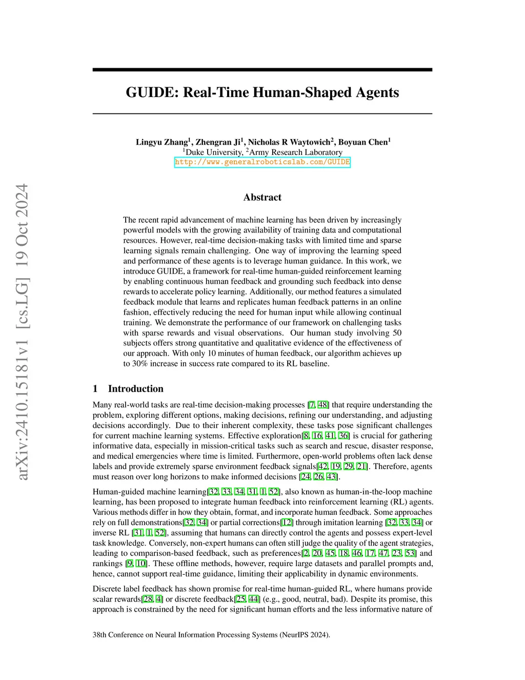 The recent rapid advancement of machine learning has been driven by increasingly powerful models with the growing availability of training data and computational resources. However, real-time decision-making tasks with limited time and sparse learning signals remain challenging. One way of improving the learning speed and performance of these agents is to leverage human guidance. In this work, we introduce GUIDE, a framework for real-time human-guided reinforcement learning by enabling continuous human feedback and grounding such feedback into dense rewards to accelerate policy learning. Additionally, our method features a simulated feedback module that learns and replicates human feedback patterns in an online fashion, effectively reducing the need for human input while allowing continual training. We demonstrate the performance of our framework on challenging tasks with sparse rewards and visual observations. Our human study involving 50 subjects offers strong quantitative and qualitative evidence of the effectiveness of our approach. With only 10 minutes of human feedback, our algorithm achieves up to 30% increase in success rate compared to its RL baseline.