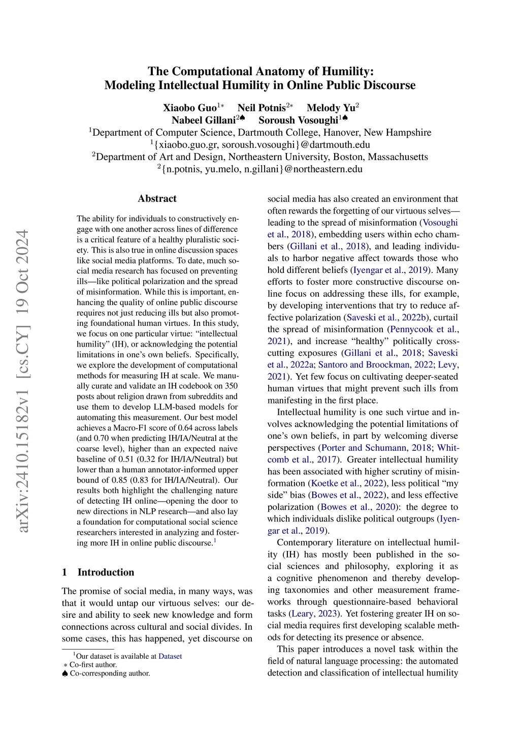 The ability for individuals to constructively engage with one another across lines of difference is a critical feature of a healthy pluralistic society. This is also true in online discussion spaces like social media platforms. To date, much social media research has focused on preventing ills -- like political polarization and the spread of misinformation. While this is important, enhancing the quality of online public discourse requires not just reducing ills but also promoting foundational human virtues. In this study, we focus on one particular virtue: ``intellectual humility'' (IH), or acknowledging the potential limitations in one's own beliefs. Specifically, we explore the development of computational methods for measuring IH at scale. We manually curate and validate an IH codebook on 350 posts about religion drawn from subreddits and use them to develop LLM-based models for automating this measurement. Our best model achieves a Macro-F1 score of 0.64 across labels (and 0.70 when predicting IH/IA/Neutral at the coarse level), higher than an expected naive baseline of 0.51 (0.32 for IH/IA/Neutral) but lower than a human annotator-informed upper bound of 0.85 (0.83 for IH/IA/Neutral). Our results both highlight the challenging nature of detecting IH online -- opening the door to new directions in NLP research -- and also lay a foundation for computational social science researchers interested in analyzing and fostering more IH in online public discourse.