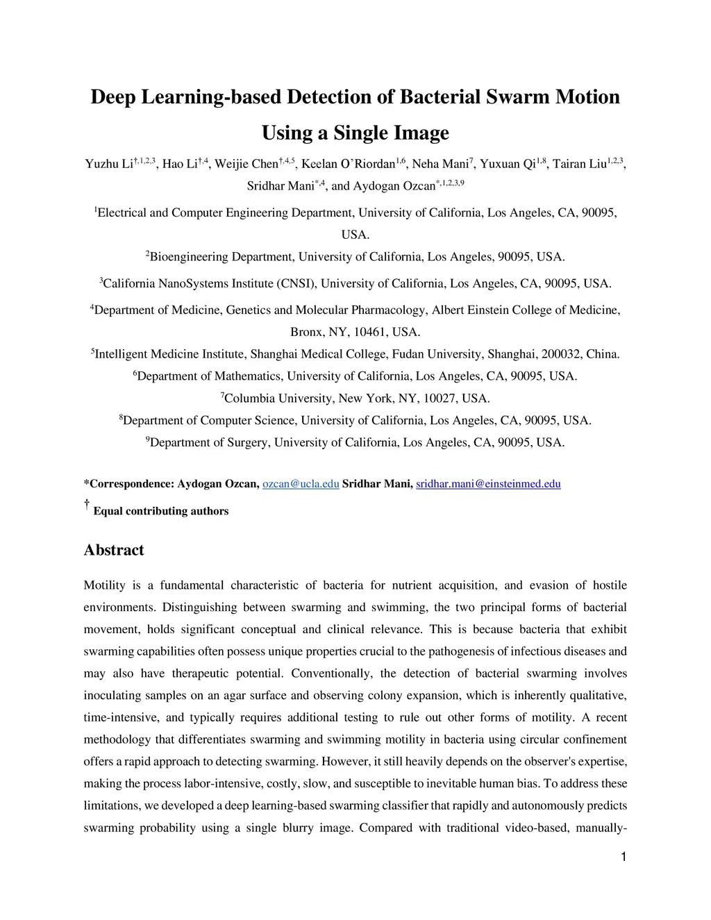 Distinguishing between swarming and swimming, the two principal forms of bacterial movement, holds significant conceptual and clinical relevance. This is because bacteria that exhibit swarming capabilities often possess unique properties crucial to the pathogenesis of infectious diseases and may also have therapeutic potential. Here, we report a deep learning-based swarming classifier that rapidly and autonomously predicts swarming probability using a single blurry image. Compared with traditional video-based, manually-processed approaches, our method is particularly suited for high-throughput environments and provides objective, quantitative assessments of swarming probability. The swarming classifier demonstrated in our work was trained on Enterobacter sp. SM3 and showed good performance when blindly tested on new swarming (positive) and swimming (negative) test images of SM3, achieving a sensitivity of 97.44% and a specificity of 100%. Furthermore, this classifier demonstrated robust external generalization capabilities when applied to unseen bacterial species, such as Serratia marcescens DB10 and Citrobacter koseri H6. It blindly achieved a sensitivity of 97.92% and a specificity of 96.77% for DB10, and a sensitivity of 100% and a specificity of 97.22% for H6. This competitive performance indicates the potential to adapt our approach for diagnostic applications through portable devices or even smartphones. This adaptation would facilitate rapid, objective, on-site screening for bacterial swarming motility, potentially enhancing the early detection and treatment assessment of various diseases, including inflammatory bowel diseases (IBD) and urinary tract infections (UTI).