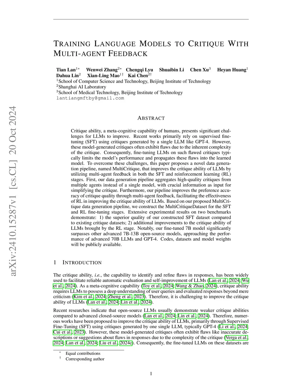 Critique ability, a meta-cognitive capability of humans, presents significant challenges for LLMs to improve. Recent works primarily rely on supervised fine-tuning (SFT) using critiques generated by a single LLM like GPT-4. However, these model-generated critiques often exhibit flaws due to the inherent complexity of the critique. Consequently, fine-tuning LLMs on such flawed critiques typically limits the model's performance and propagates these flaws into the learned model. To overcome these challenges, this paper proposes a novel data generation pipeline, named MultiCritique, that improves the critique ability of LLMs by utilizing multi-agent feedback in both the SFT and reinforcement learning (RL) stages. First, our data generation pipeline aggregates high-quality critiques from multiple agents instead of a single model, with crucial information as input for simplifying the critique. Furthermore, our pipeline improves the preference accuracy of critique quality through multi-agent feedback, facilitating the effectiveness of RL in improving the critique ability of LLMs. Based on our proposed MultiCritique data generation pipeline, we construct the MultiCritiqueDataset for the SFT and RL fine-tuning stages. Extensive experimental results on two benchmarks demonstrate: 1) the superior quality of our constructed SFT dataset compared to existing critique datasets; 2) additional improvements to the critique ability of LLMs brought by the RL stage. Notably, our fine-tuned 7B model significantly surpasses other advanced 7B-13B open-source models, approaching the performance of advanced 70B LLMs and GPT-4. Codes, datasets and model weights will be publicly available.