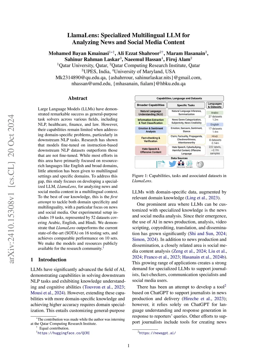 Large Language Models (LLMs) have demonstrated remarkable success as general-purpose task solvers across various fields. However, their capabilities remain limited when addressing domain-specific problems, particularly in downstream NLP tasks. Research has shown that models fine-tuned on instruction-based downstream NLP datasets outperform those that are not fine-tuned. While most efforts in this area have primarily focused on resource-rich languages like English and broad domains, little attention has been given to multilingual settings and specific domains. To address this gap, this study focuses on developing a specialized LLM, LlamaLens, for analyzing news and social media content in a multilingual context. To the best of our knowledge, this is the first attempt to tackle both domain specificity and multilinguality, with a particular focus on news and social media. Our experimental setup includes 18 tasks, represented by 52 datasets covering Arabic, English, and Hindi. We demonstrate that LlamaLens outperforms the current state-of-the-art (SOTA) on 23 testing sets, and achieves comparable performance on 8 sets. We make the models and resources publicly available for the research community (this https URL).