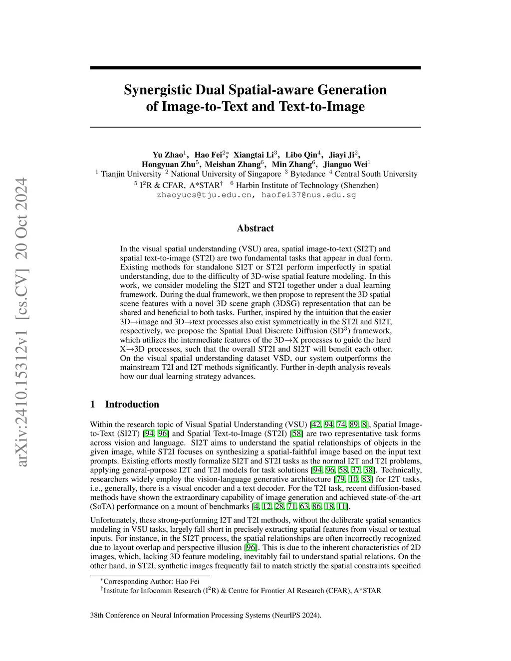 In the visual spatial understanding (VSU) area, spatial image-to-text (SI2T) and spatial text-to-image (ST2I) are two fundamental tasks that appear in dual form. Existing methods for standalone SI2T or ST2I perform imperfectly in spatial understanding, due to the difficulty of 3D-wise spatial feature modeling. In this work, we consider modeling the SI2T and ST2I together under a dual learning framework. During the dual framework, we then propose to represent the 3D spatial scene features with a novel 3D scene graph (3DSG) representation that can be shared and beneficial to both tasks. Further, inspired by the intuition that the easier 3Dimage and 3Dtext processes also exist symmetrically in the ST2I and SI2T, respectively, we propose the Spatial Dual Discrete Diffusion (SD) framework, which utilizes the intermediate features of the 3DX processes to guide the hard X3D processes, such that the overall ST2I and SI2T will benefit each other. On the visual spatial understanding dataset VSD, our system outperforms the mainstream T2I and I2T methods significantly. Further in-depth analysis reveals how our dual learning strategy advances.